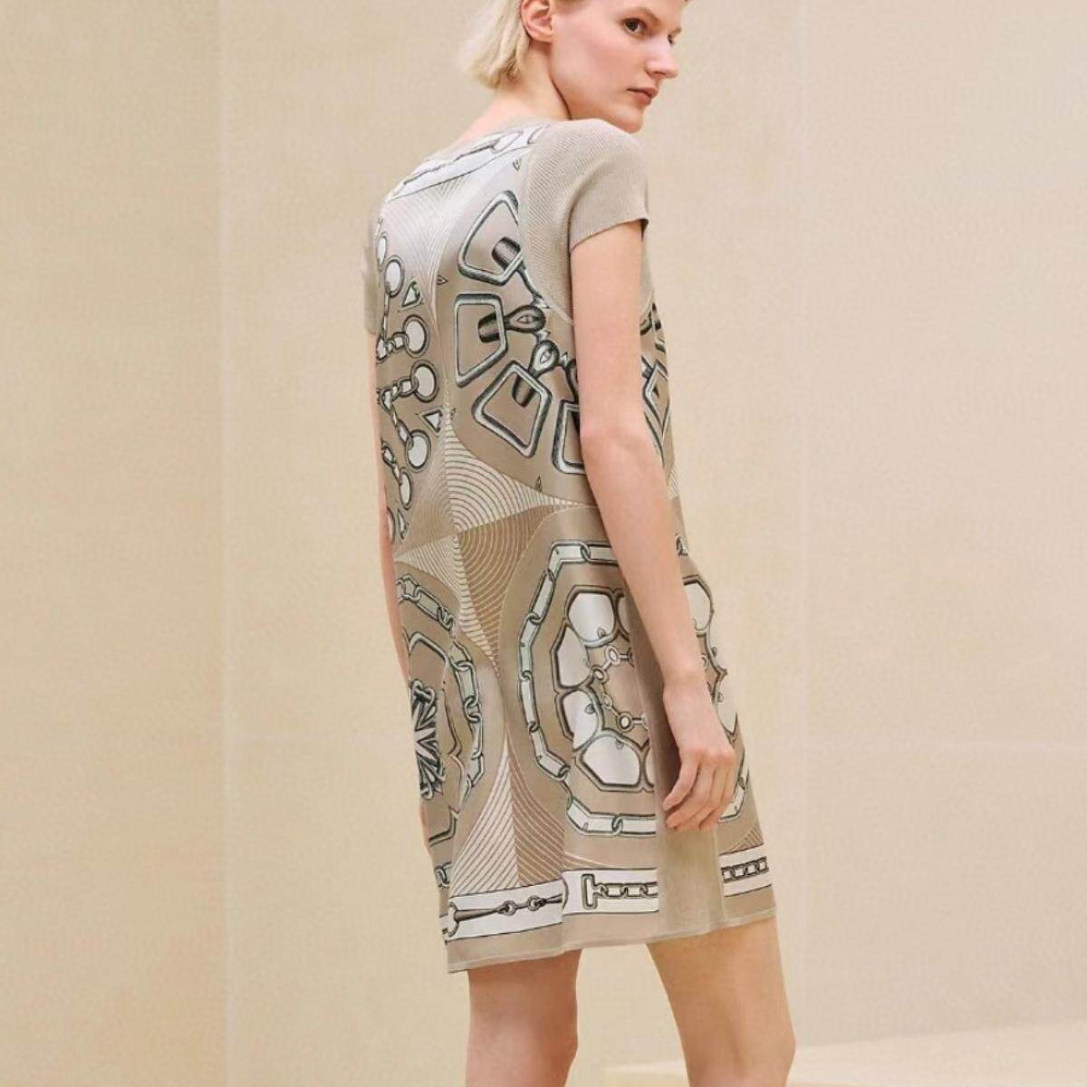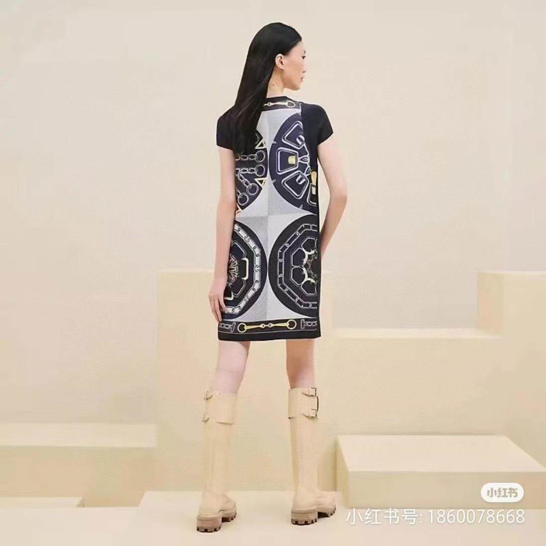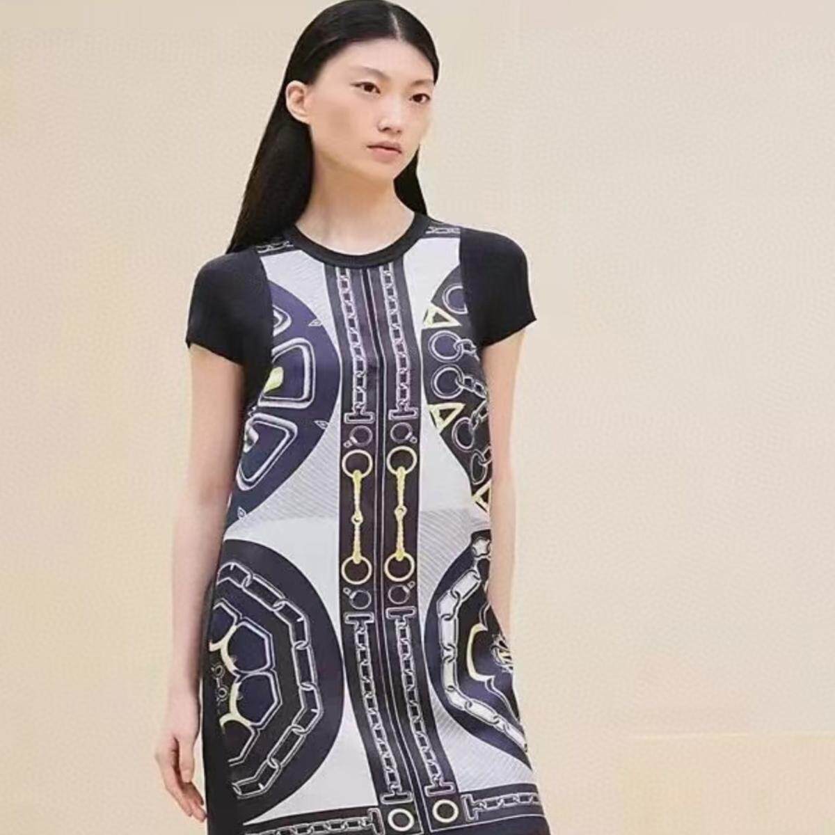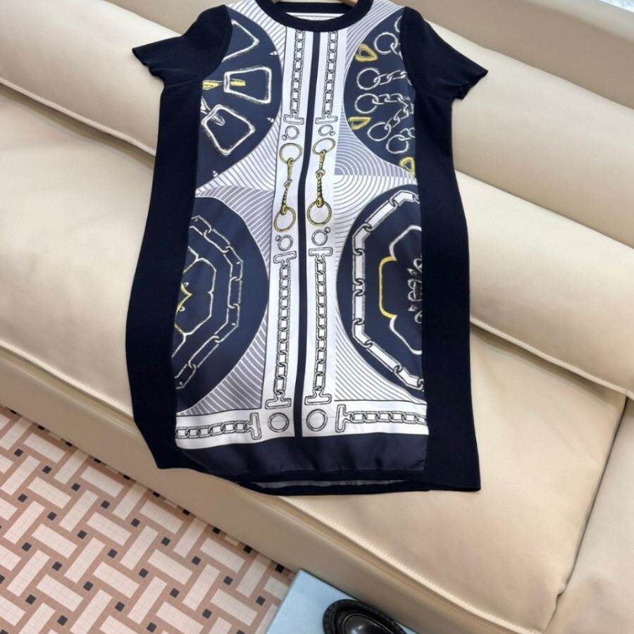 25春新款定位印花重磅真丝斜纹绸拼接羊毛针织短袖连衣裙