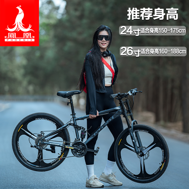 凤凰双减震软尾山地自行车男女成人青少年轻便双碟刹越野变速单车