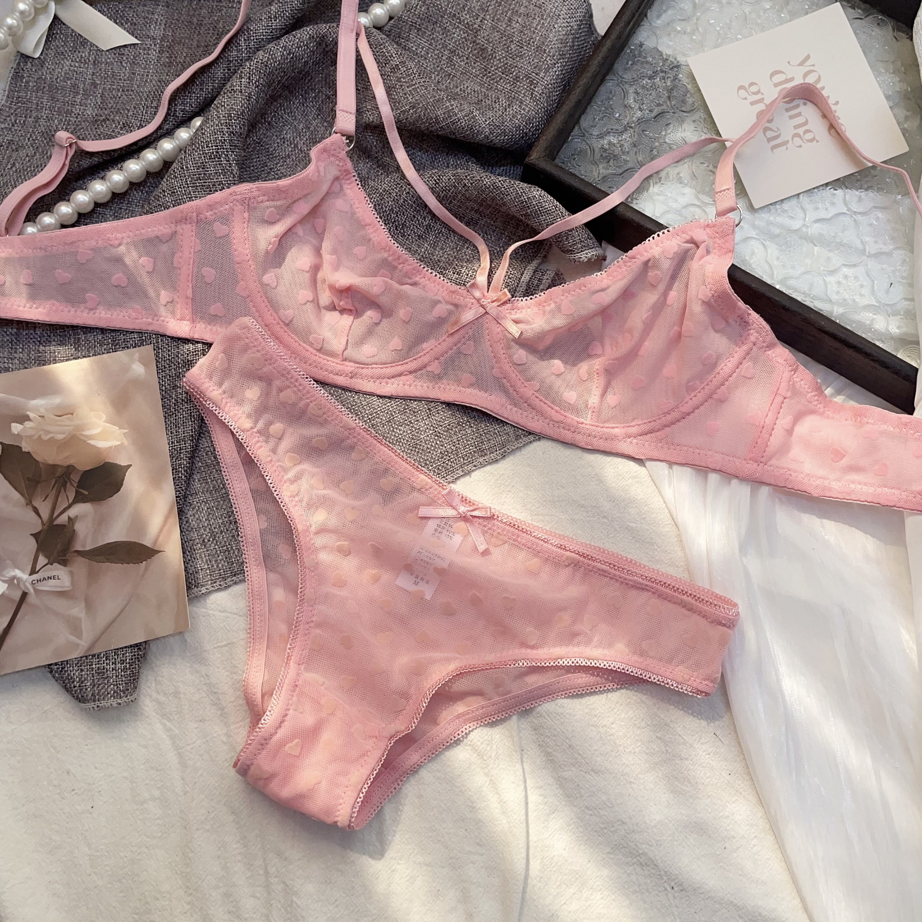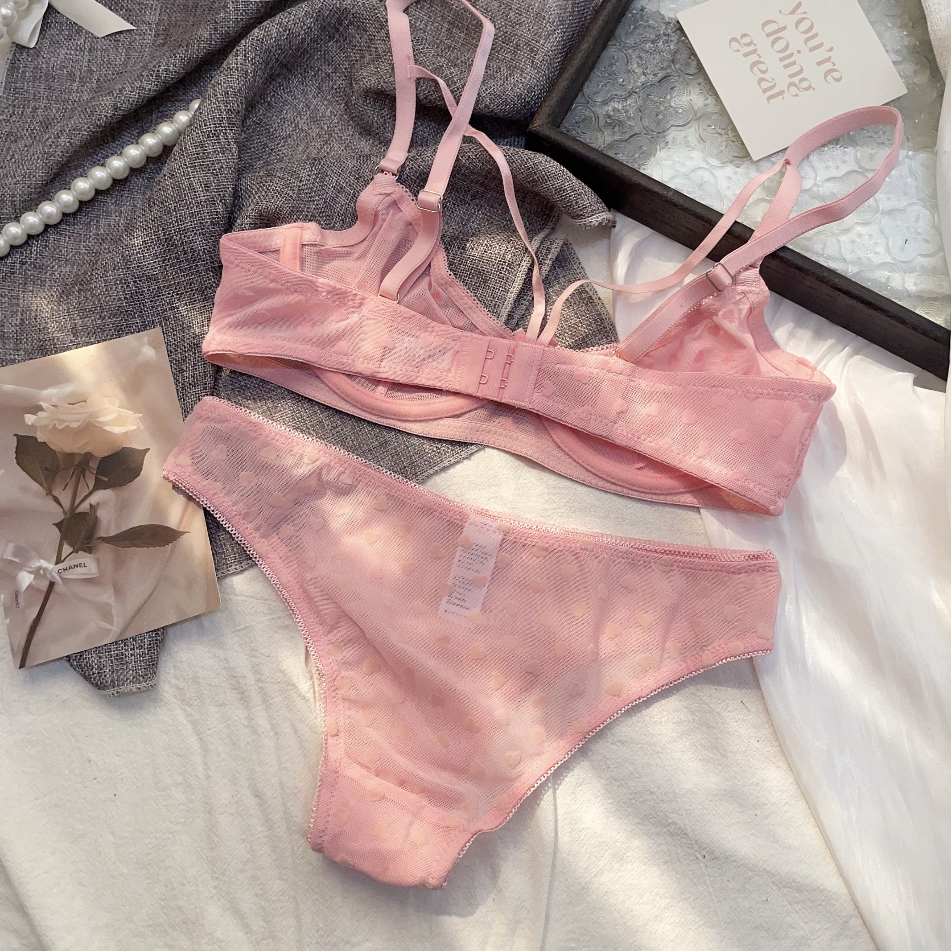 粉色法式文胸套装女性感透明钢圈内衣超薄网纱舒适透气迷人女生