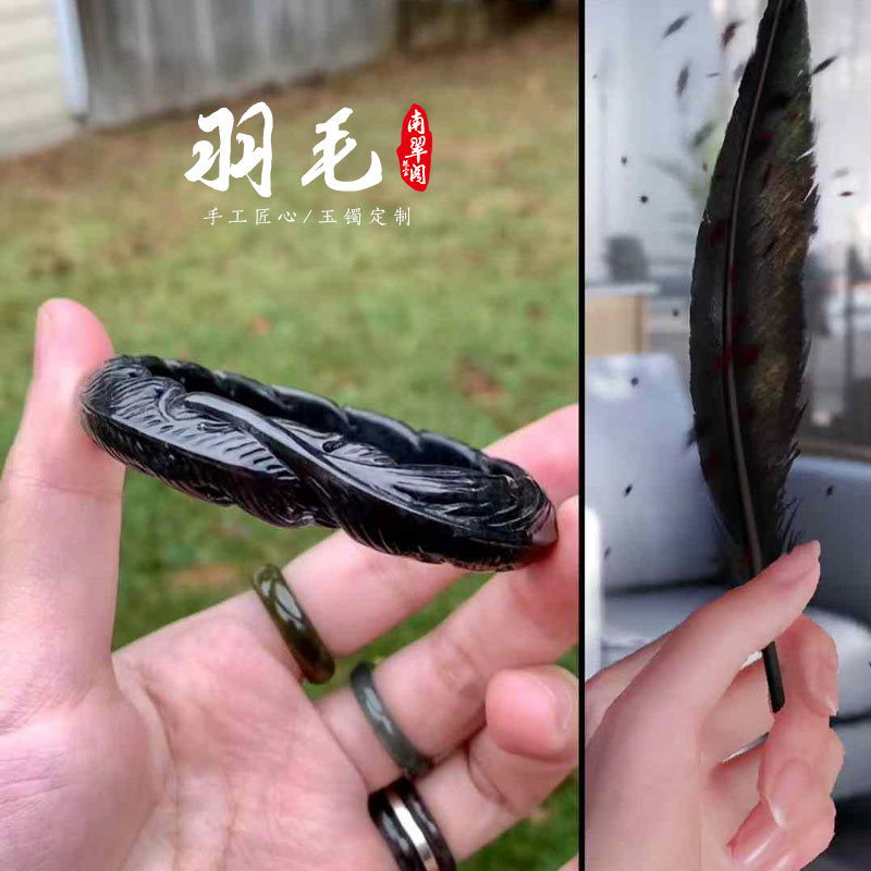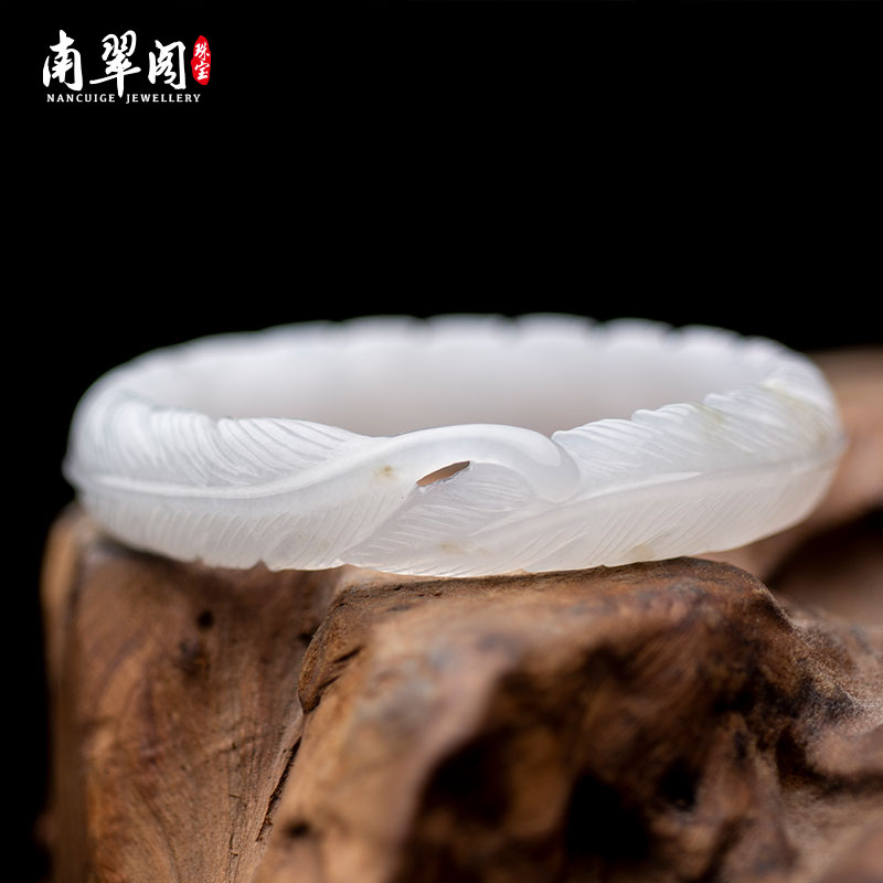 羽毛水墨雕花手镯白冰飘花翡翠天然缅甸a货玉镯子大师手工精雕刻