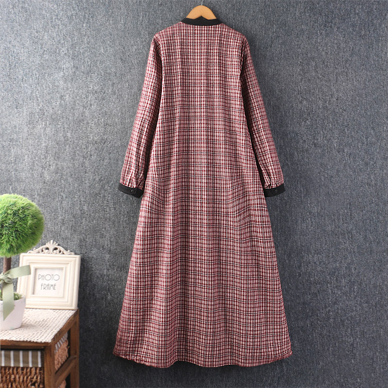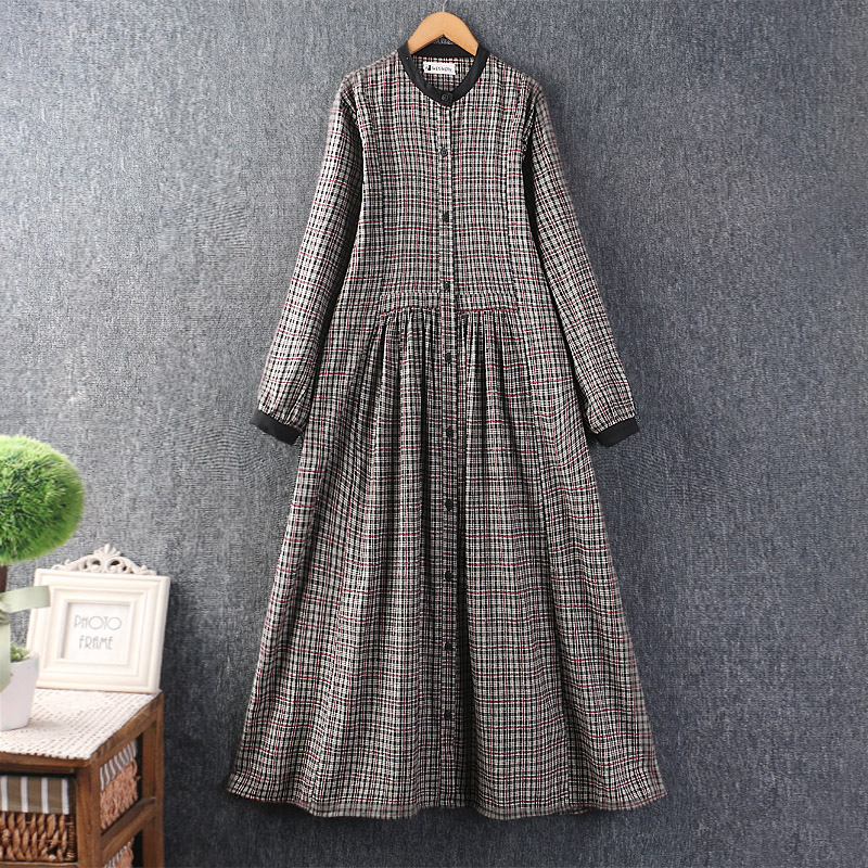 秋装新款女装日系甜美立领千鸟格棉麻长袖连衣裙宽松长裙叠穿