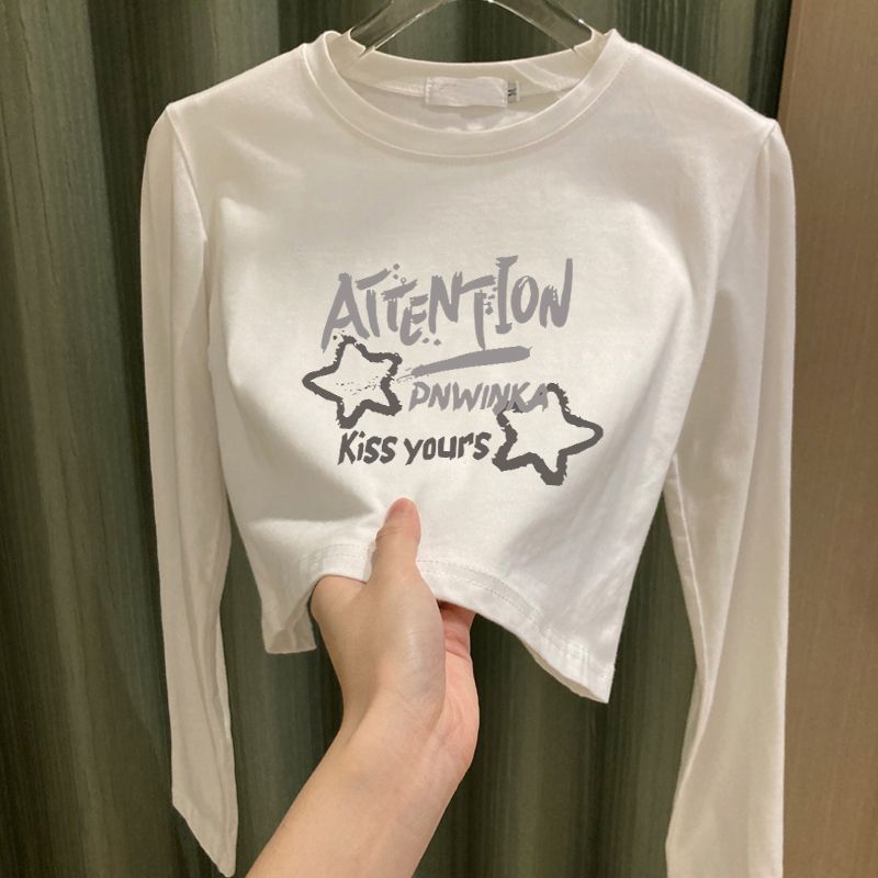 春秋薄款新款纯棉长袖T恤韩版印花宽松百搭上衣ins短款女生小个子