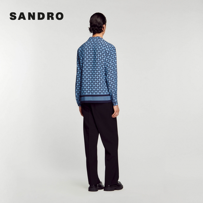 SANDRO Outlets秋冬男装法式简约休闲十字印花复古蓝色衬衫上衣