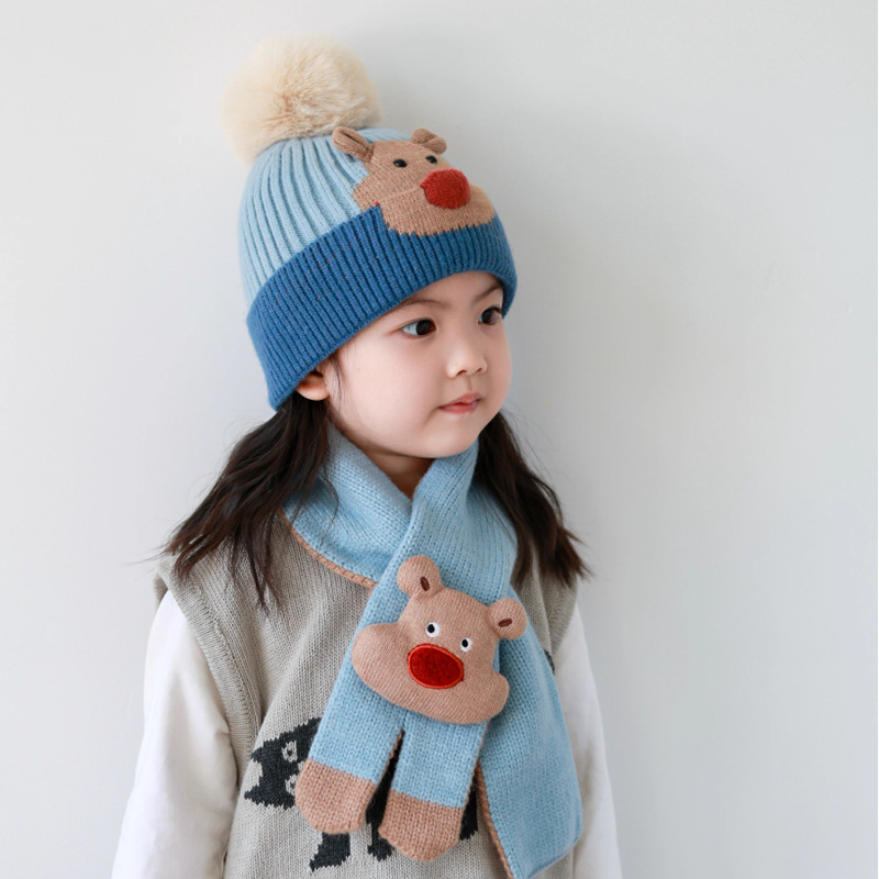 儿童毛线帽秋冬季韩版可爱小兔男女童帽子围脖两件套宝宝防风保暖