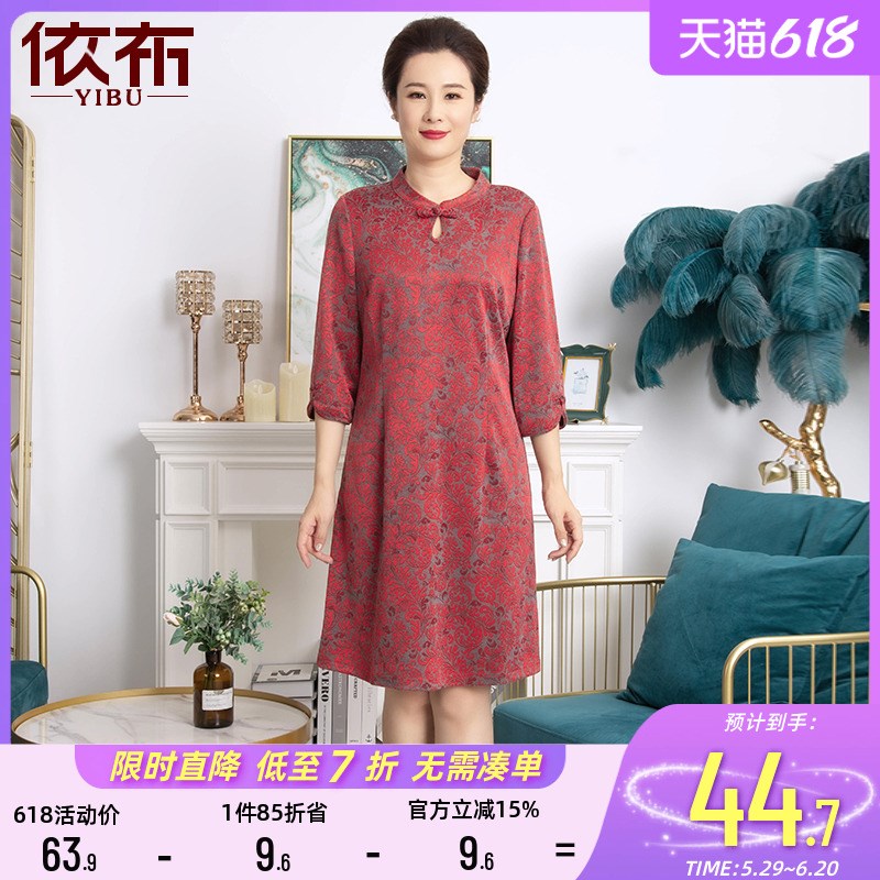 依佈中老年女士气质新中式连衣裙优雅妈妈装中裙宽松显瘦中袖裙子