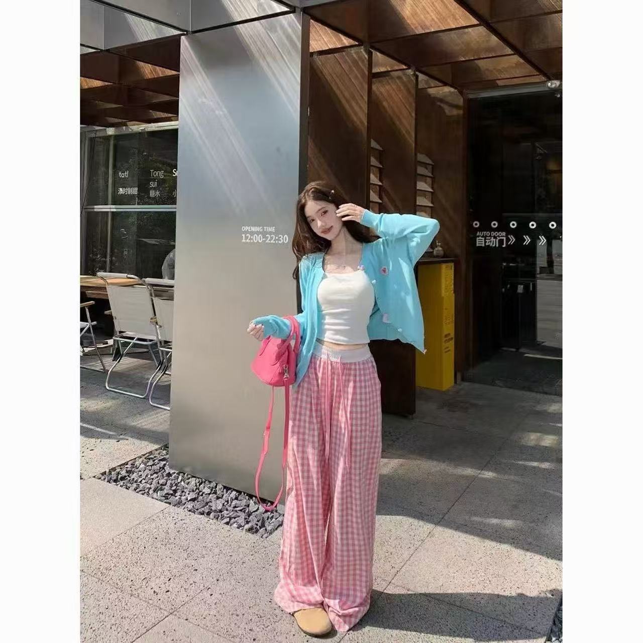 韩系甜美两件针织开衫2025春季休闲格子毛衣阔腿裤套装两件套