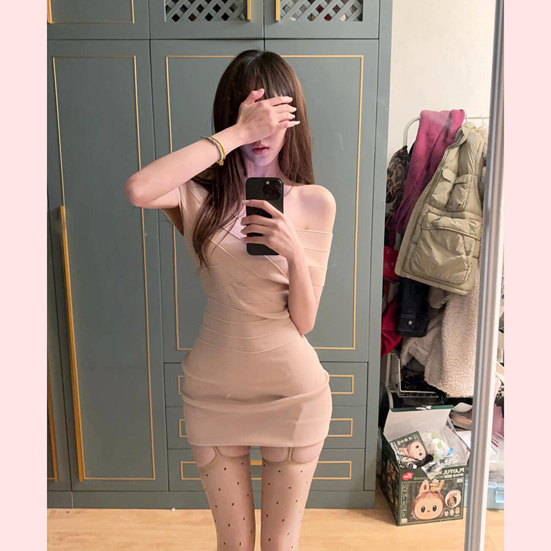【TiTi美少女】纯欲性感交叉针织连衣裙一字肩包臀裙修身冰丝短裙