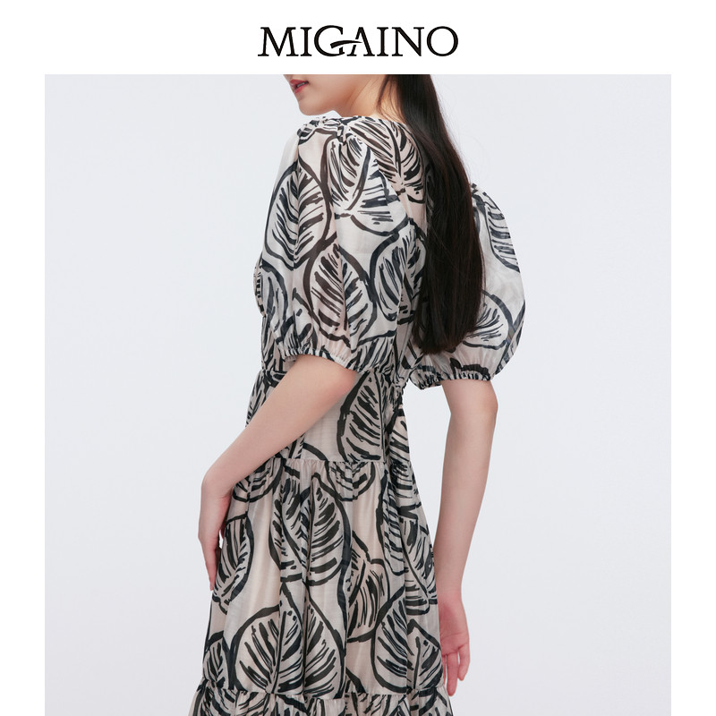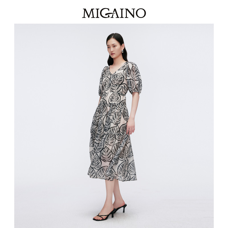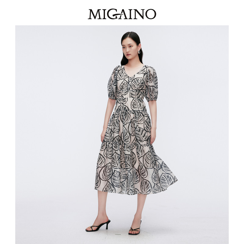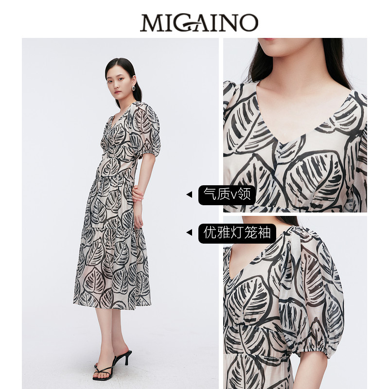 Migaino曼娅奴女装夏季新款V领中长款印花连衣裙MO22DA081