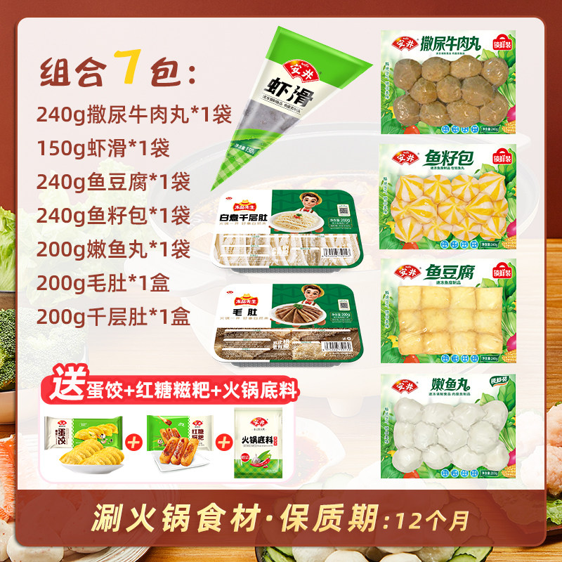 安井 牛肉丸+虾滑+鱼豆腐+鱼籽包+嫩鱼丸+毛肚+千层肚涮火锅食材