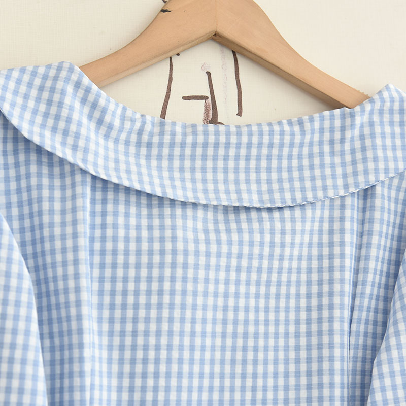 阔系の浅蓝色格子衬衫短款长袖衬衣娃娃衫2025秋新款气质上衣
