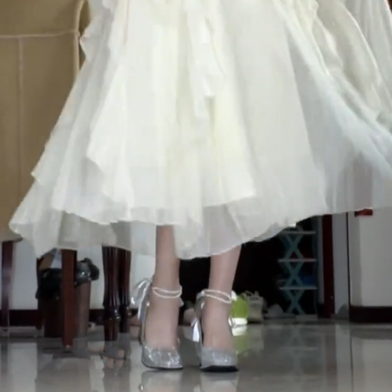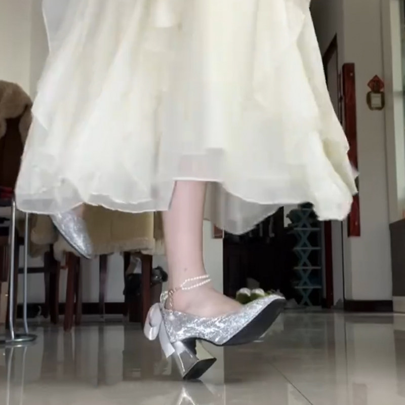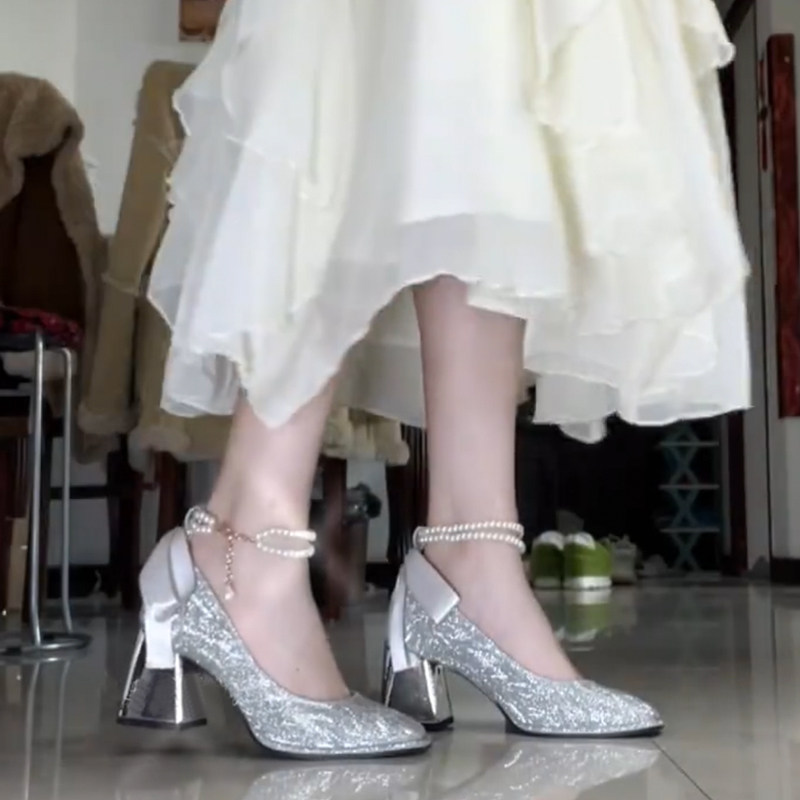 法式银色礼服高跟鞋女粗跟2025新款18岁成人礼水晶主婚纱新娘婚鞋