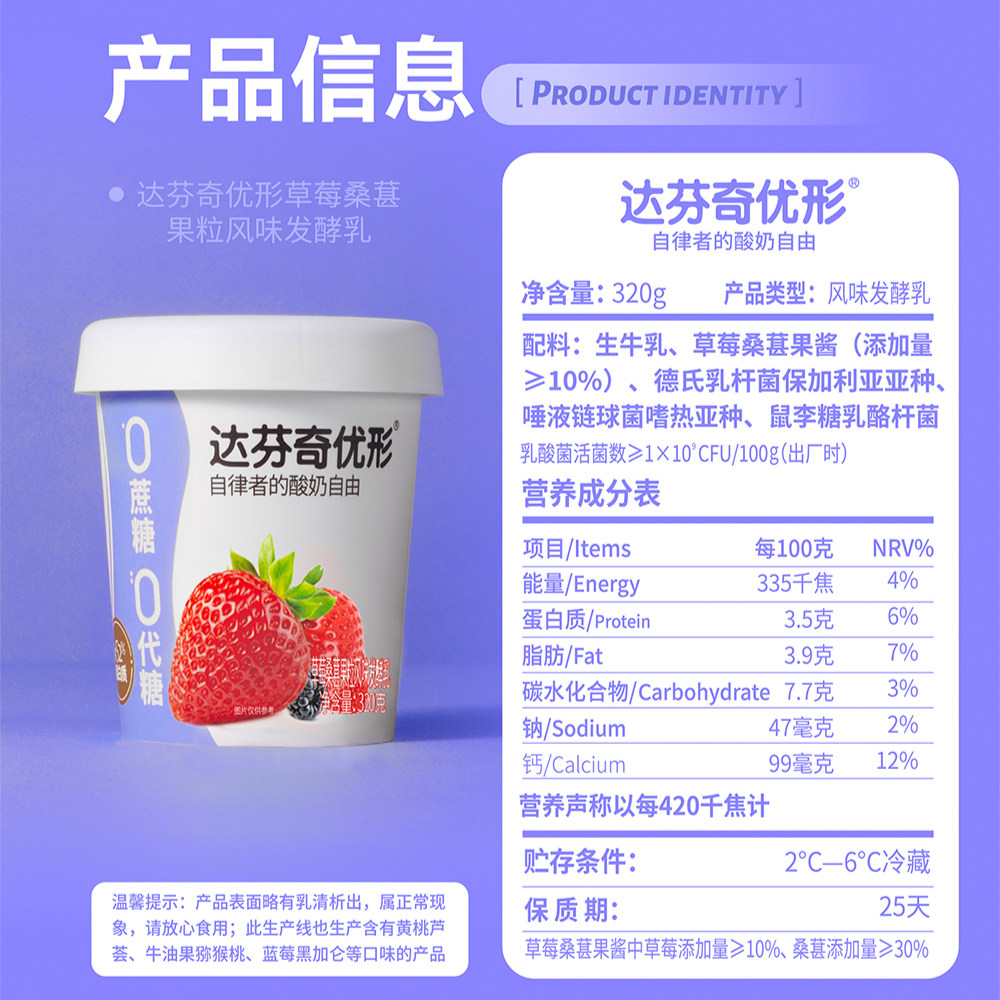 达芬奇酸奶低温优形大果粒儿童酸奶无蔗糖无代糖320g