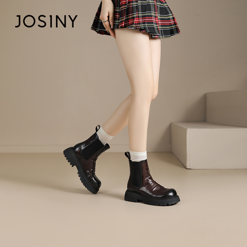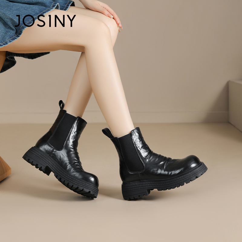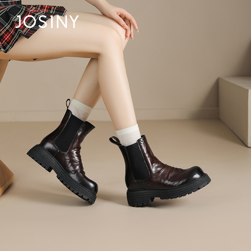 卓诗尼2025秋冬季新款厚底真皮牛皮女鞋单里加绒短靴子女靴烟筒靴