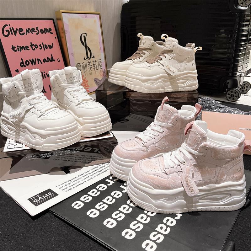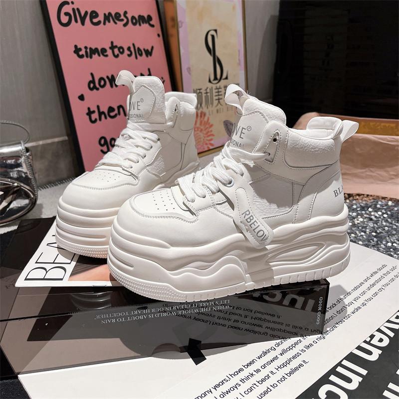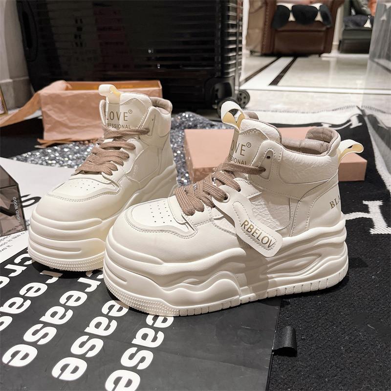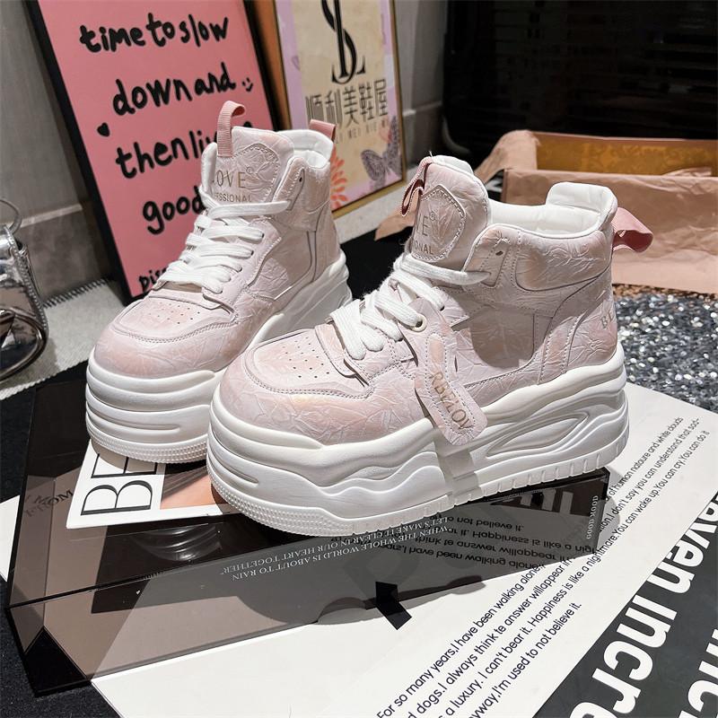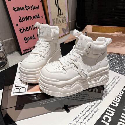 韩版真皮厚底松糕高帮珠光小白鞋溶解鞋休闲运动鞋板鞋面包女鞋潮