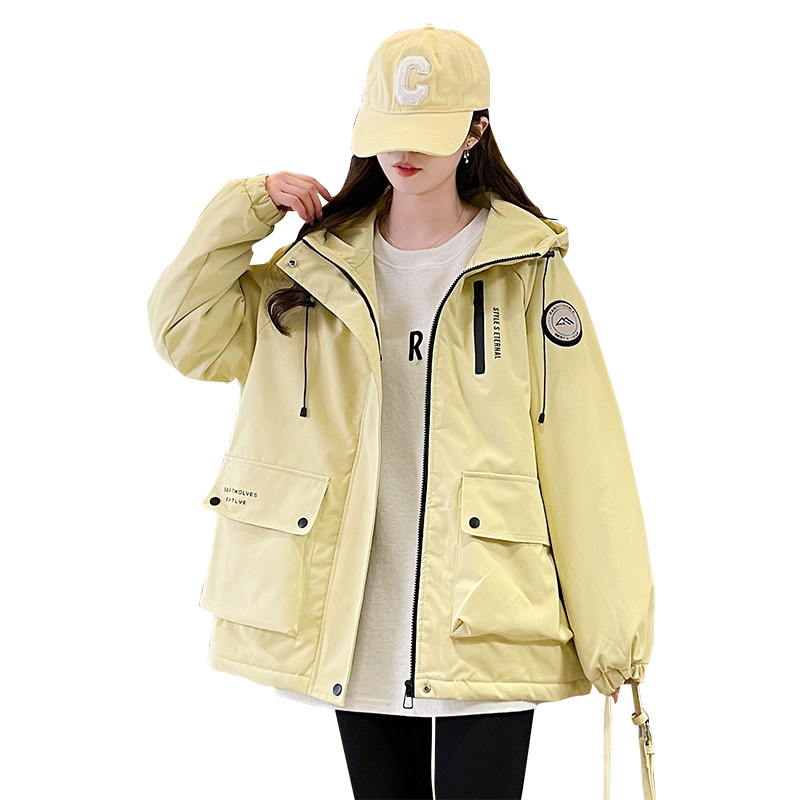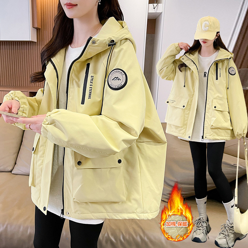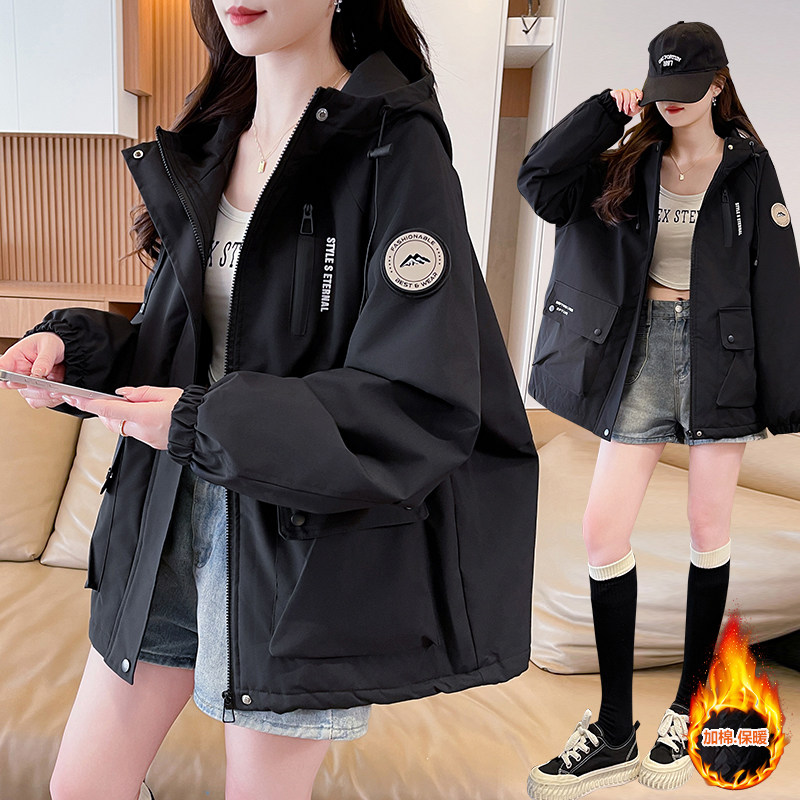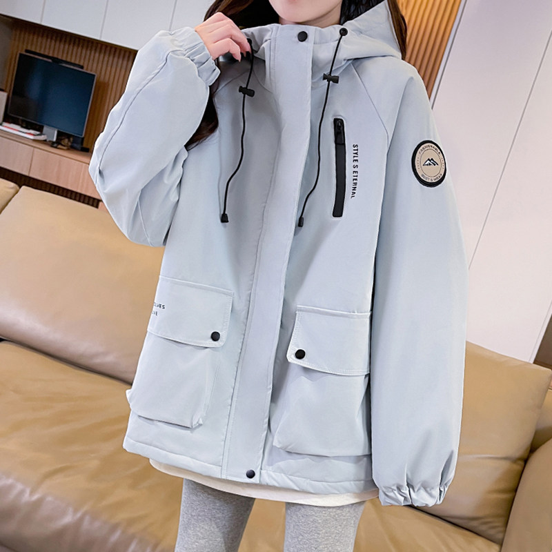 浅蓝色加棉加厚冲锋衣外套女2025秋冬季新款宽松学生休闲连帽棉服