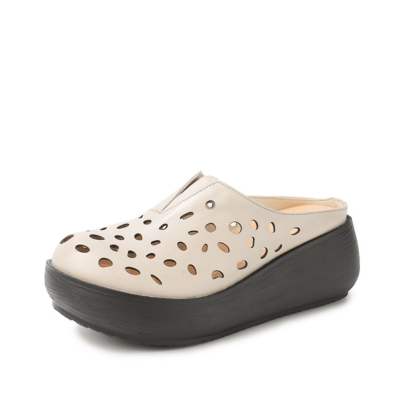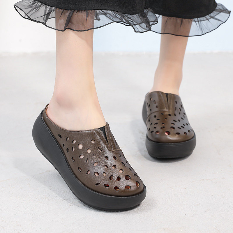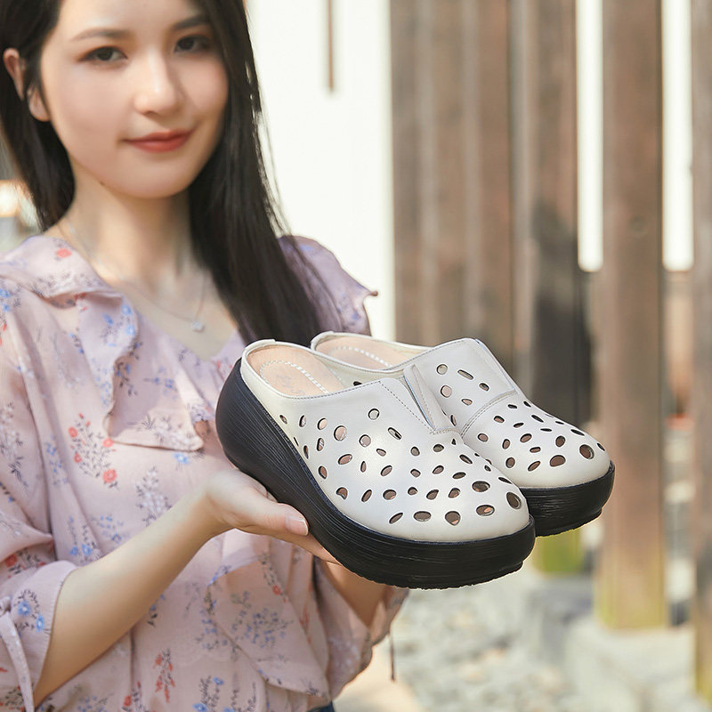 真皮镂空高跟凉拖鞋2025夏季新品透气包头女鞋夏厚底坡跟牛皮拖鞋
