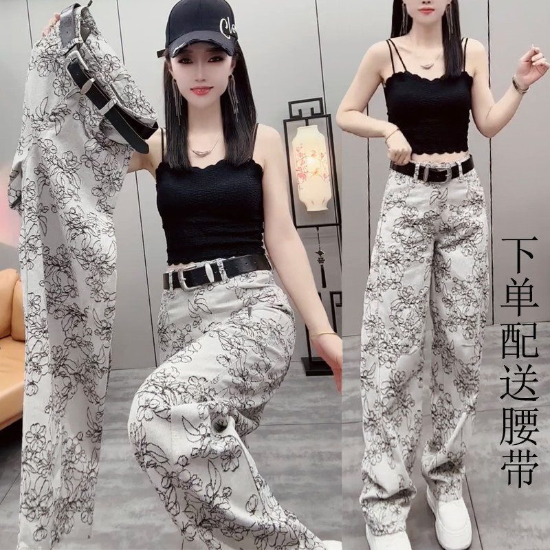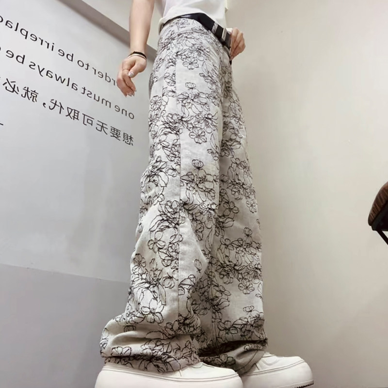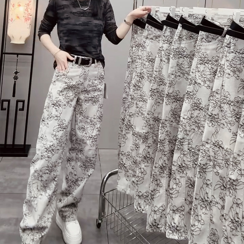 2026春季薄款提花水洗牛仔裤女国风高腰显瘦艺术洋气百搭拖地长裤