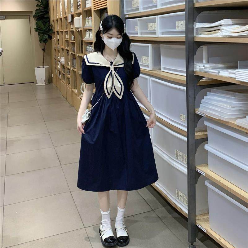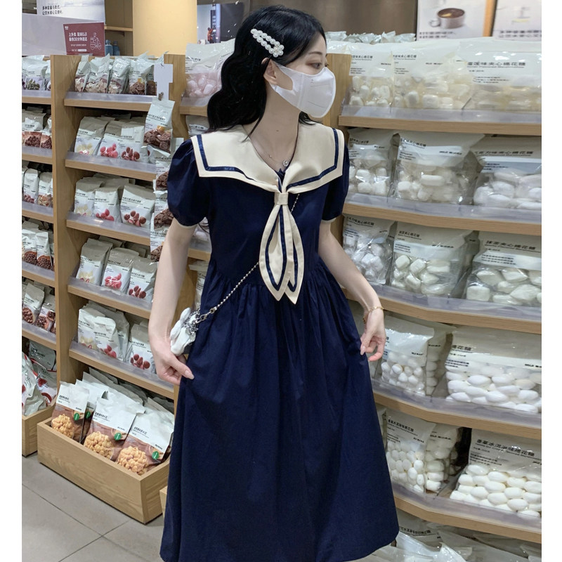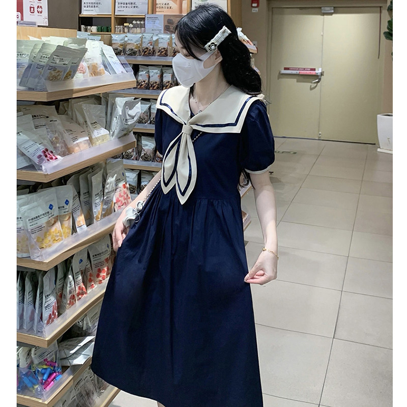 少女学院风海军领撞色连衣裙2025夏装新款初高中学生收腰显瘦裙子