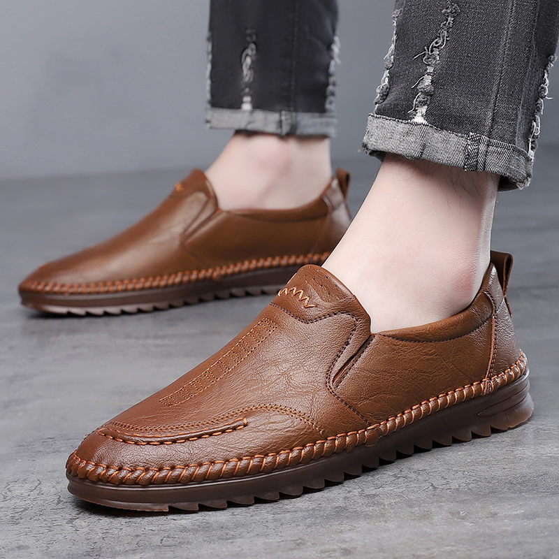 休闲皮鞋男士秋冬季真皮商务牛筋底爸爸鞋一脚蹬开车鞋软底豆豆鞋