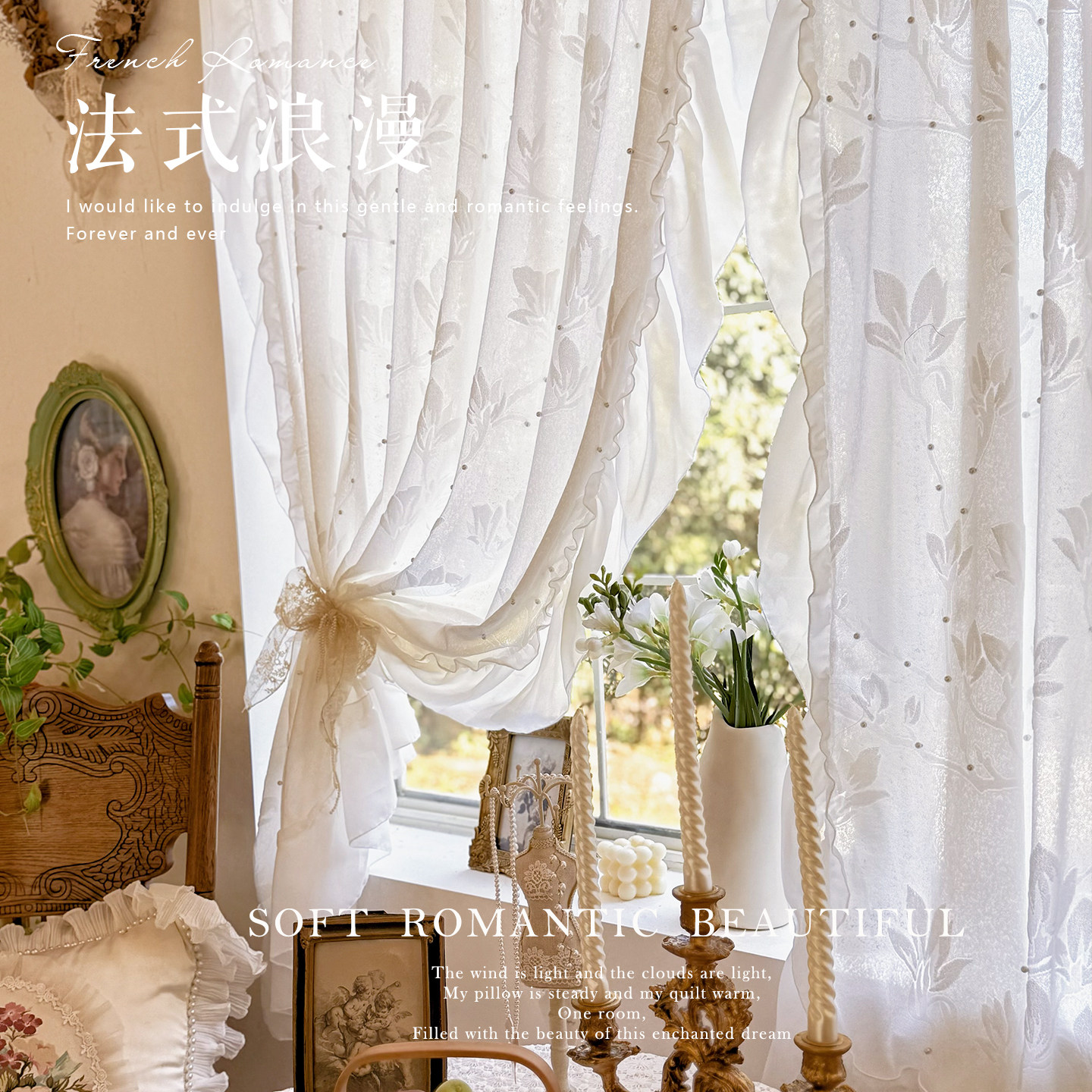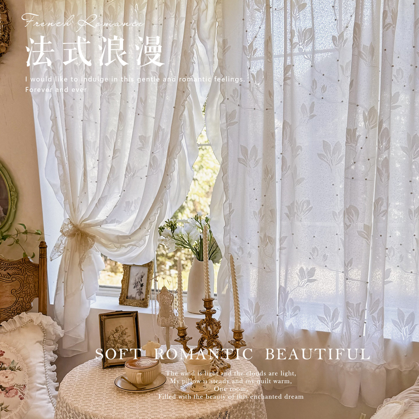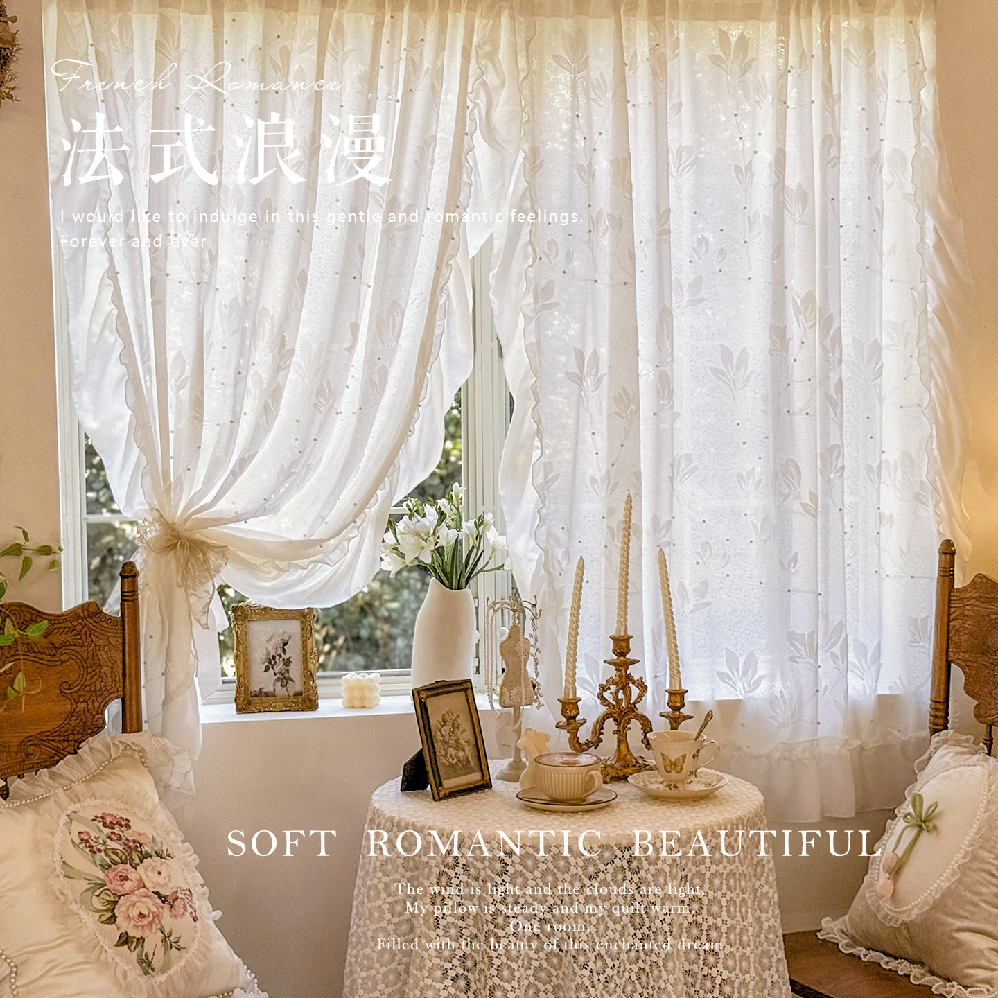 法式浪漫奶油风蕾丝珍珠纱帘卧室飘窗唯美隔断半帘氛围感窗帘白纱
