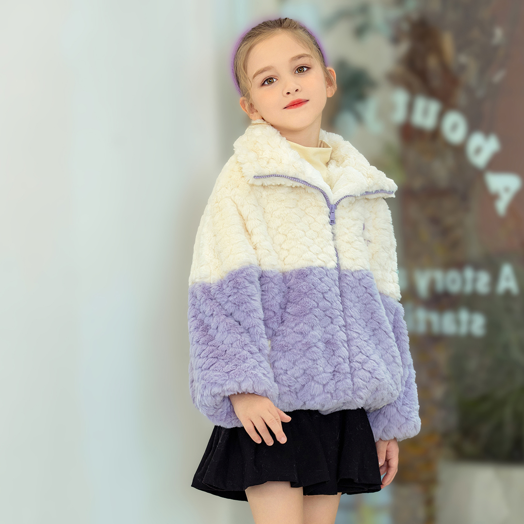 缤宝童装女童秋冬厚外套拉链翻领中长款宽松拼接加绒加厚毛毛棉衣