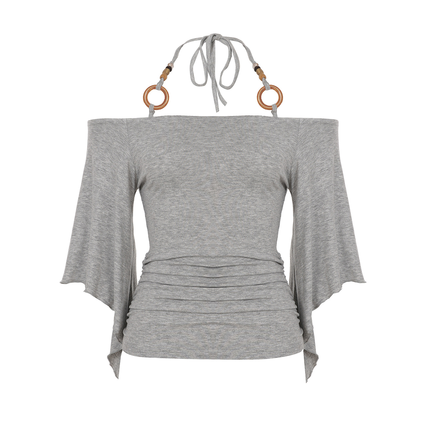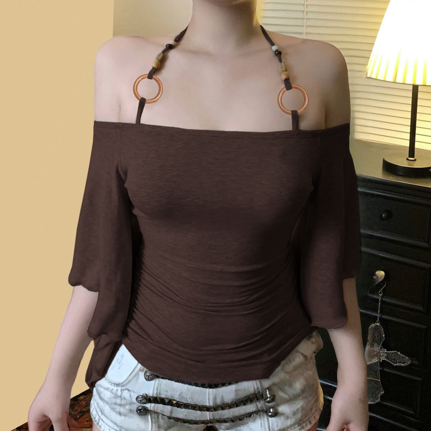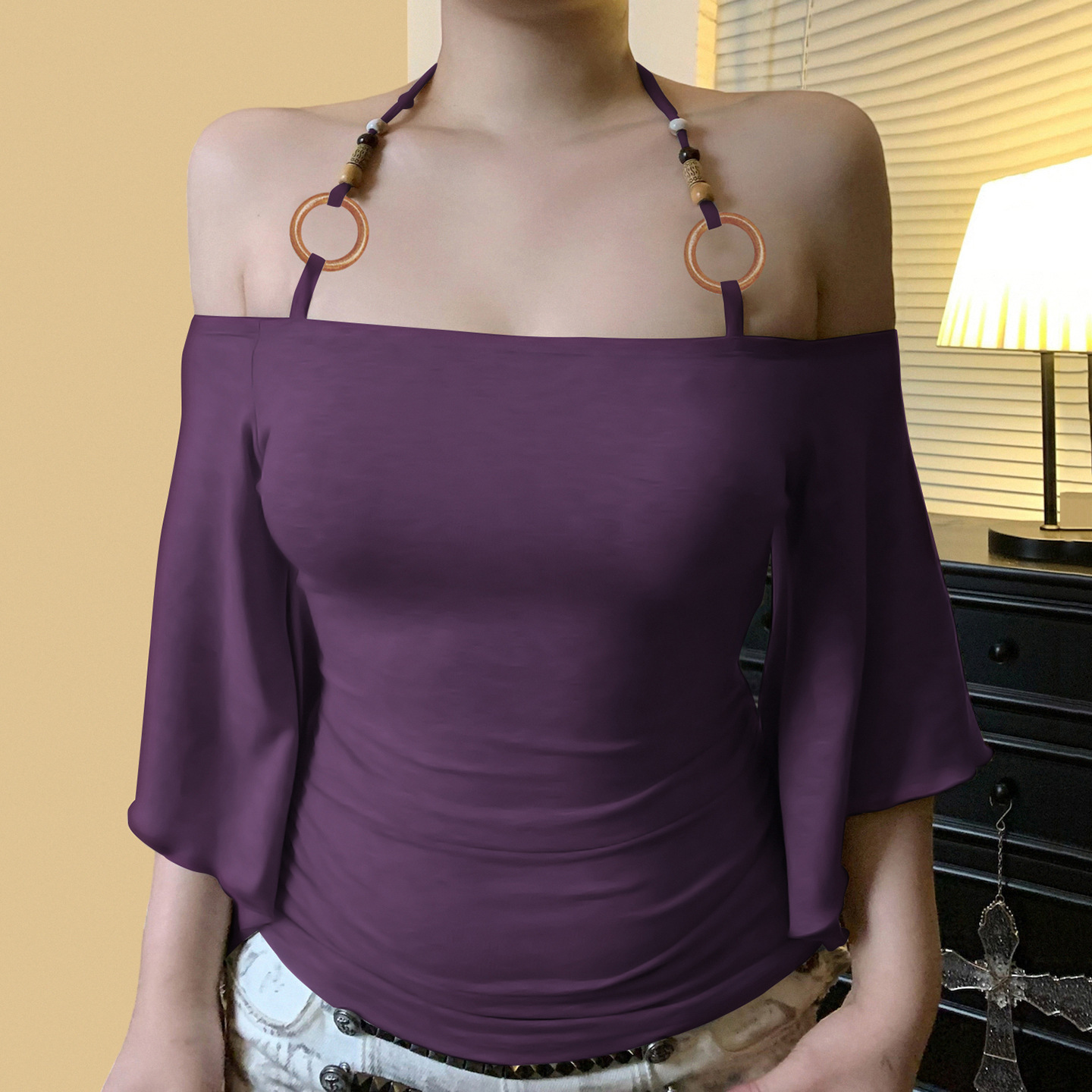 欧美纯色一字肩木珠挂脖系带蝙蝠袖上衣性感辣妹修身显瘦露肩T恤