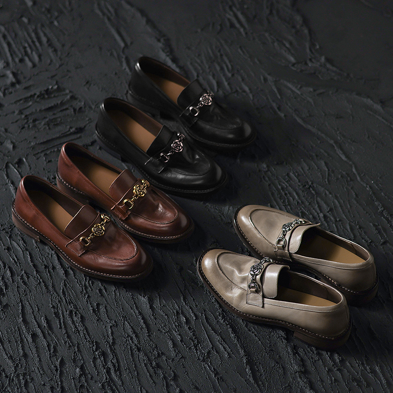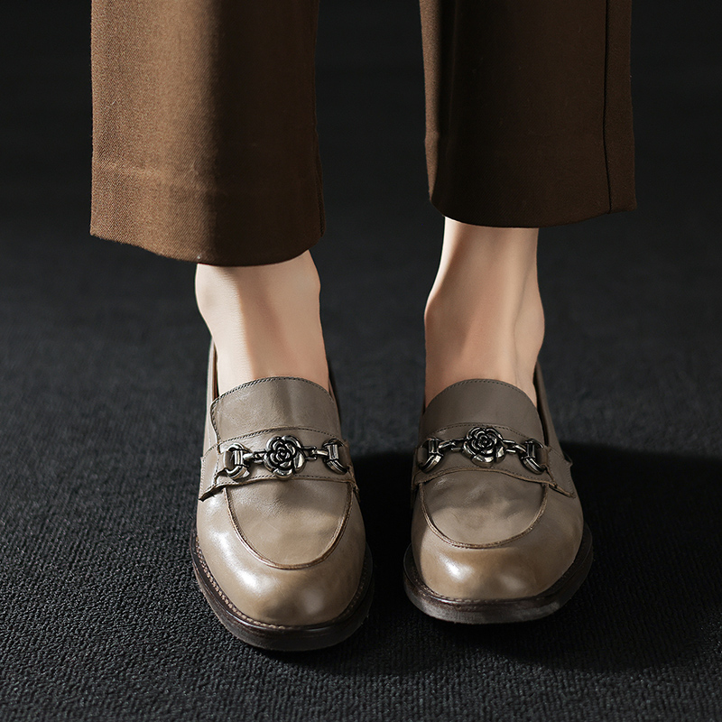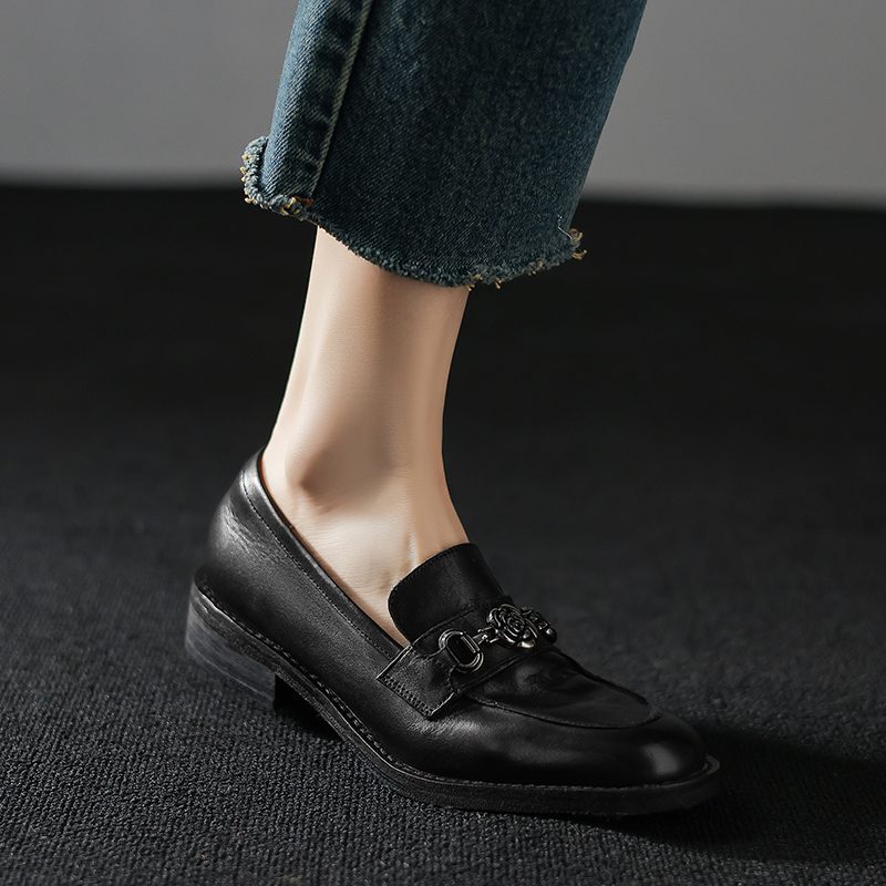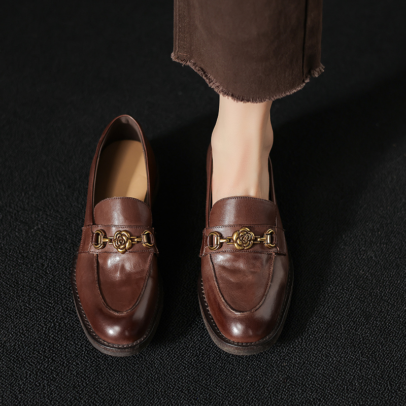 2025春季新款头层牛皮一脚蹬乐福鞋女粗跟单鞋山茶花英伦小皮鞋女