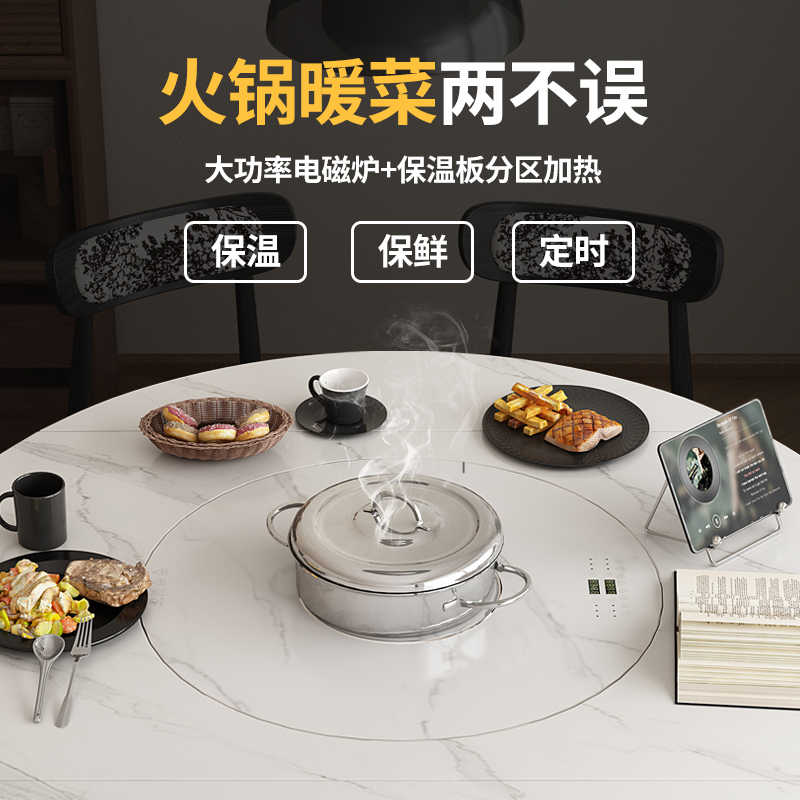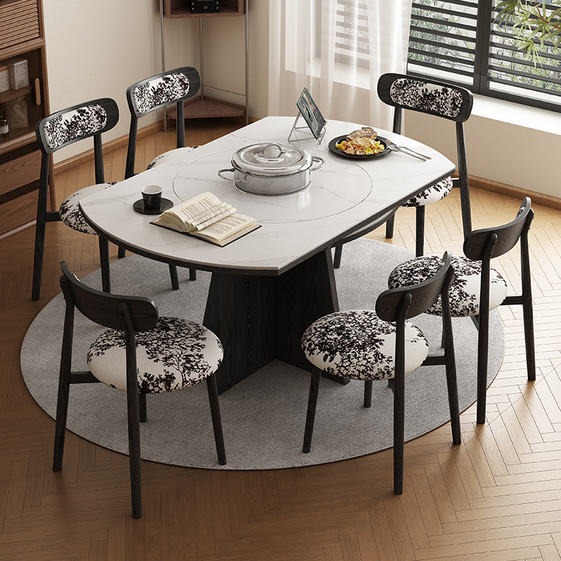 中古风实木岩板餐桌椅组合圆形两用可伸缩变圆桌黑色家用吃饭桌子