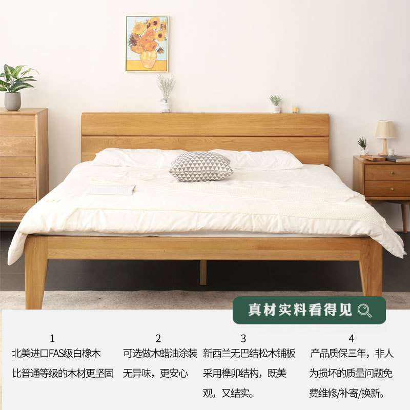 实木双人床1.8米 1.5m北欧现代简约卧室婚床加高 橡木公寓酒店床