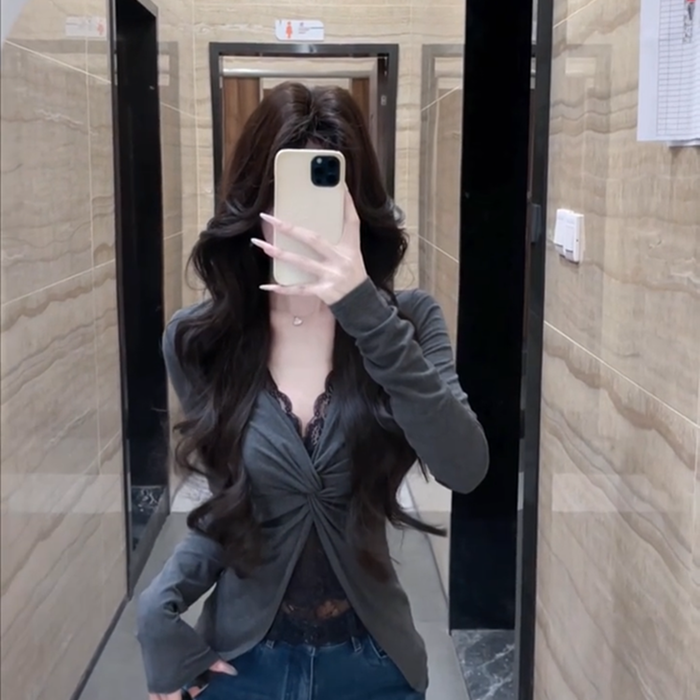 灰色假两件长袖打底衫女2025秋冬季初秋韩系穿搭蕾丝t恤辣妹上衣