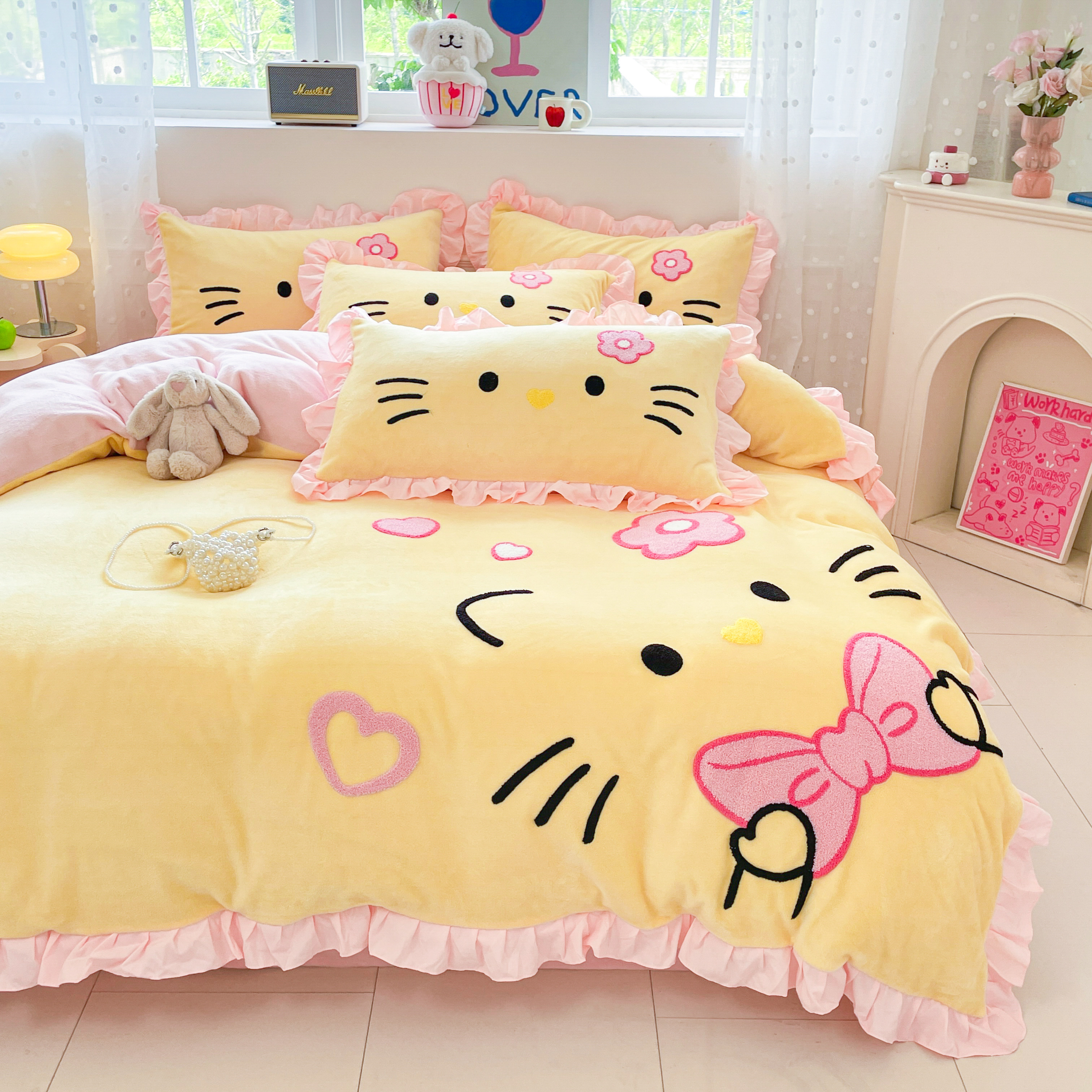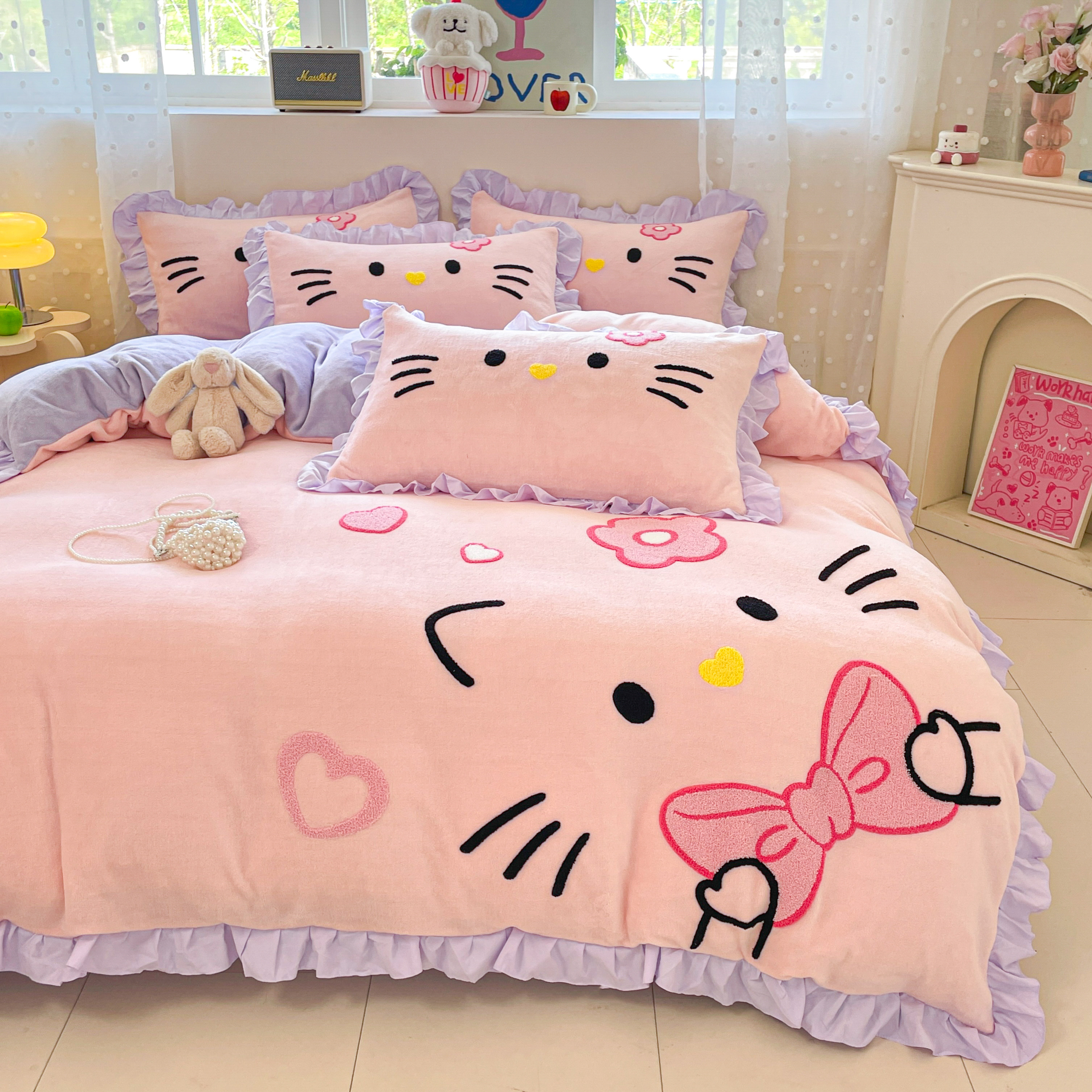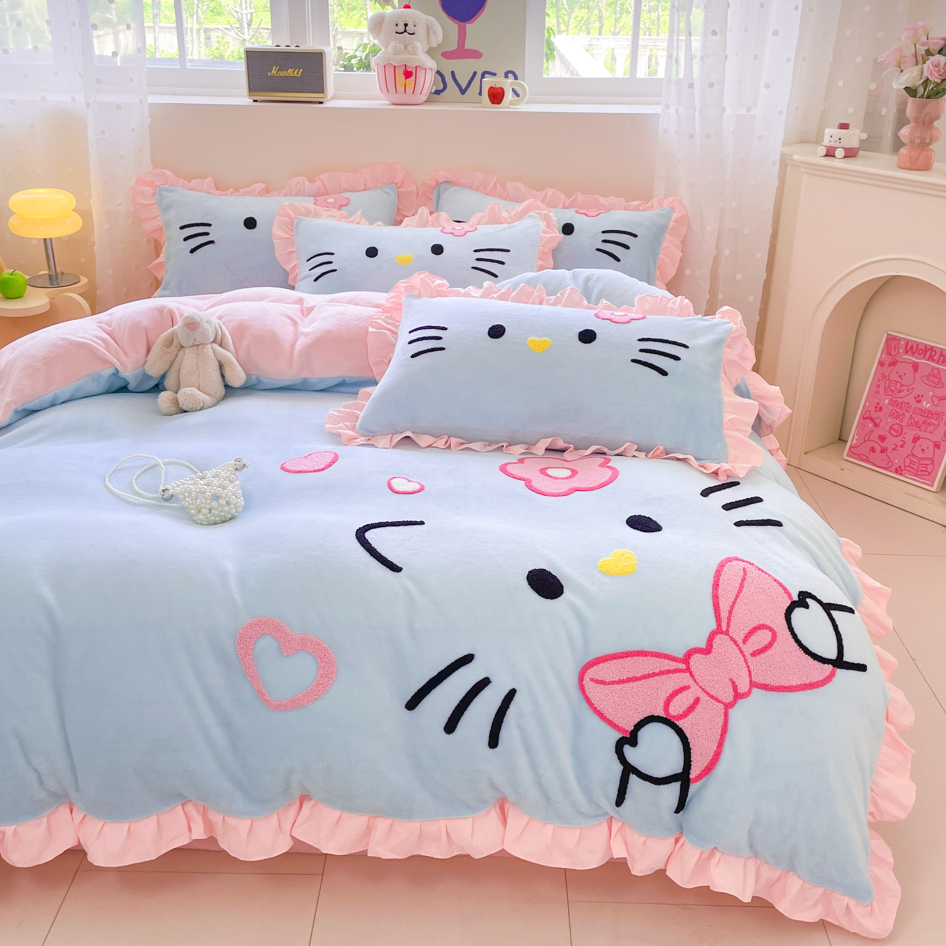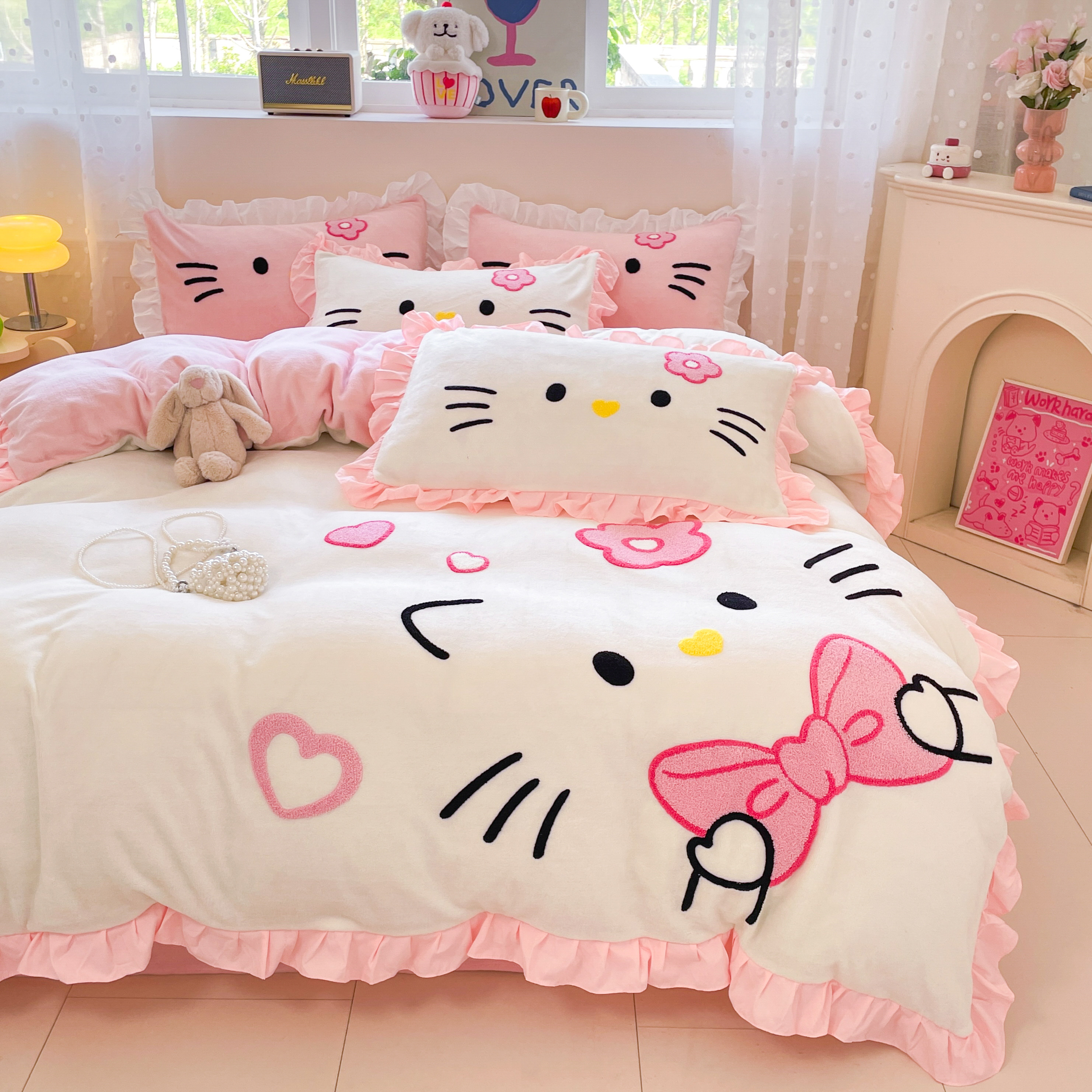 hellokitty牛奶绒四件套毛巾绣可爱KT猫珊瑚绒加厚三被套床单件套