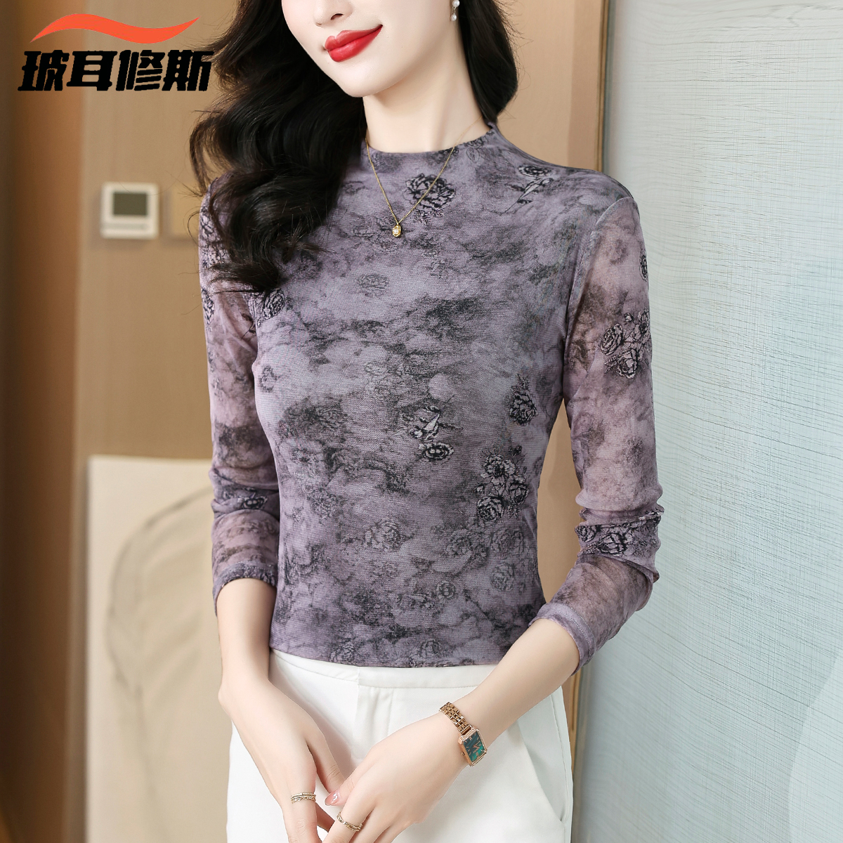 气质半高领打底衫女秋冬内搭大码网纱上衣妈妈装长袖T恤洋气小衫