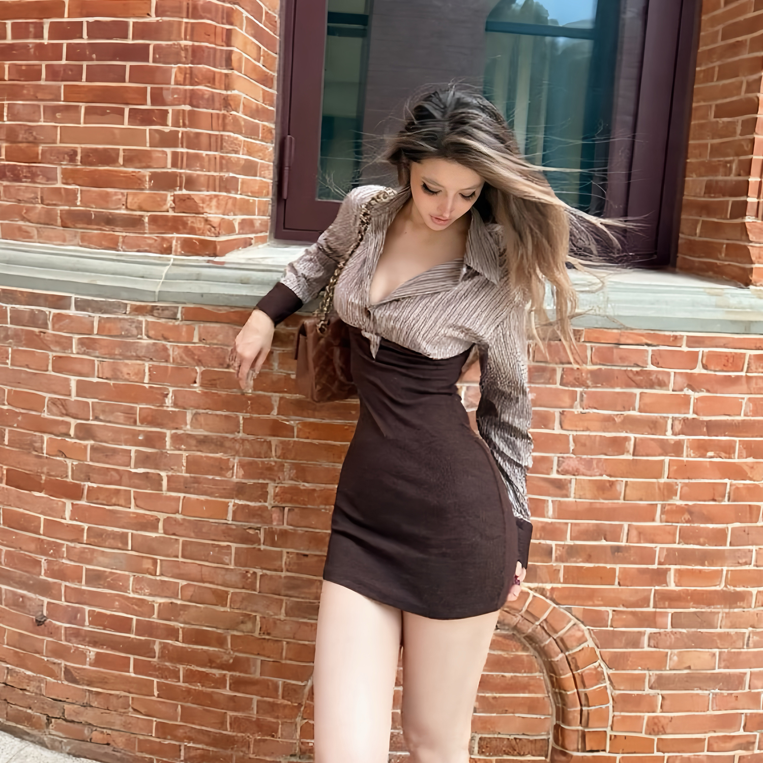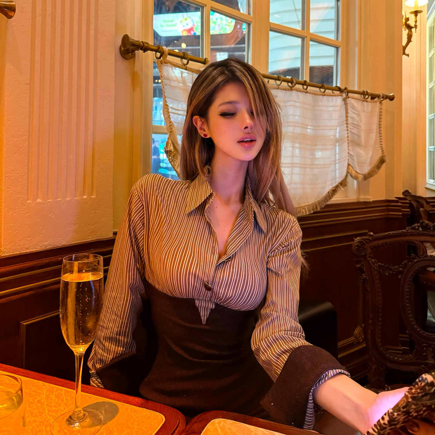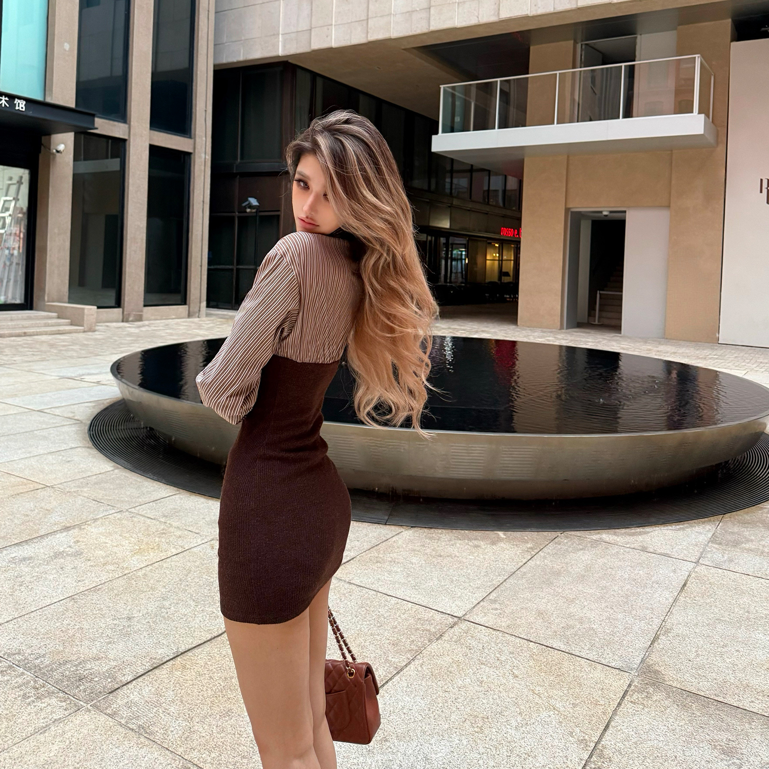 PrettyDragon拼接针织显瘦假两件条纹衬衫裙包臀短裙收腰连衣裙女