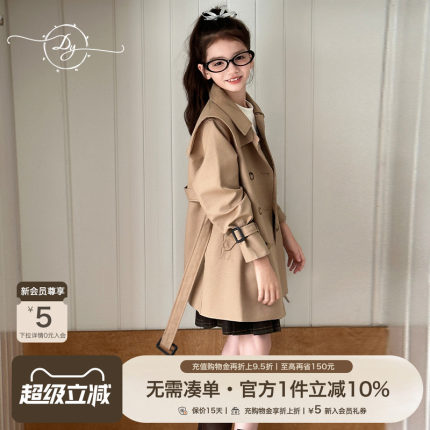 小叮尤尤女童双排扣风衣2025秋季新款小女孩英伦风儿童中长款外套