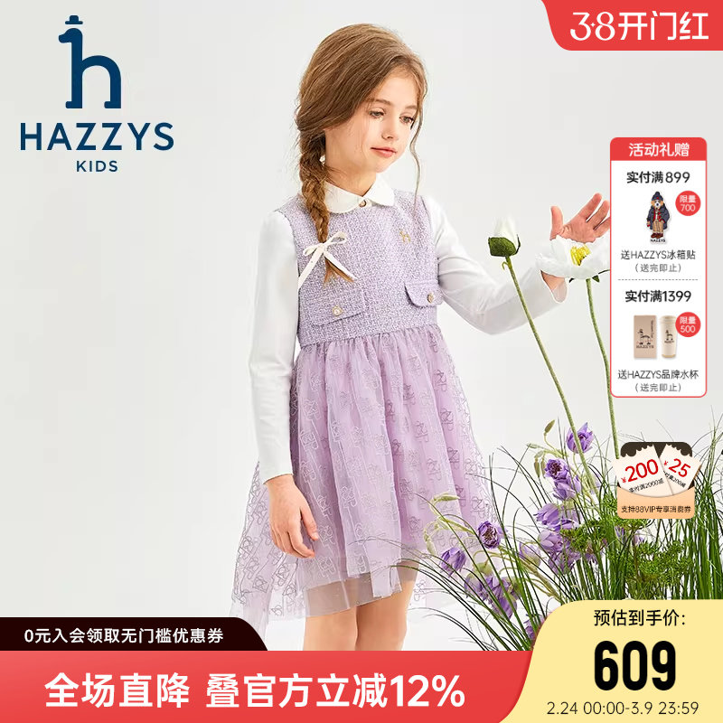 hazzys哈吉斯童装女童裙子春新中大童网纱裙摆浪漫气质马甲裙