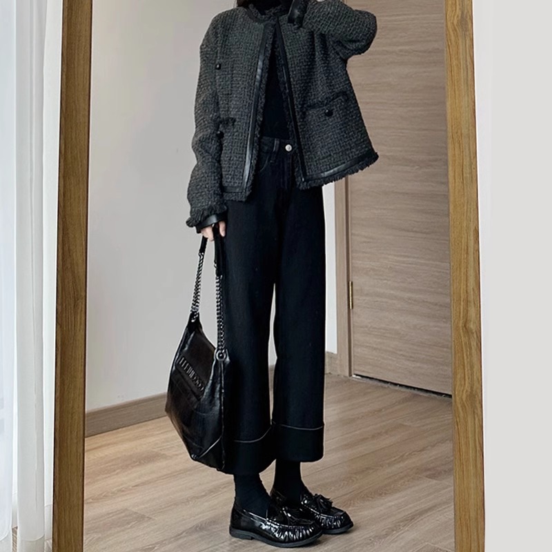 免费试穿加绒黑色直筒牛仔裤