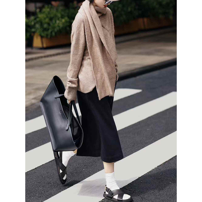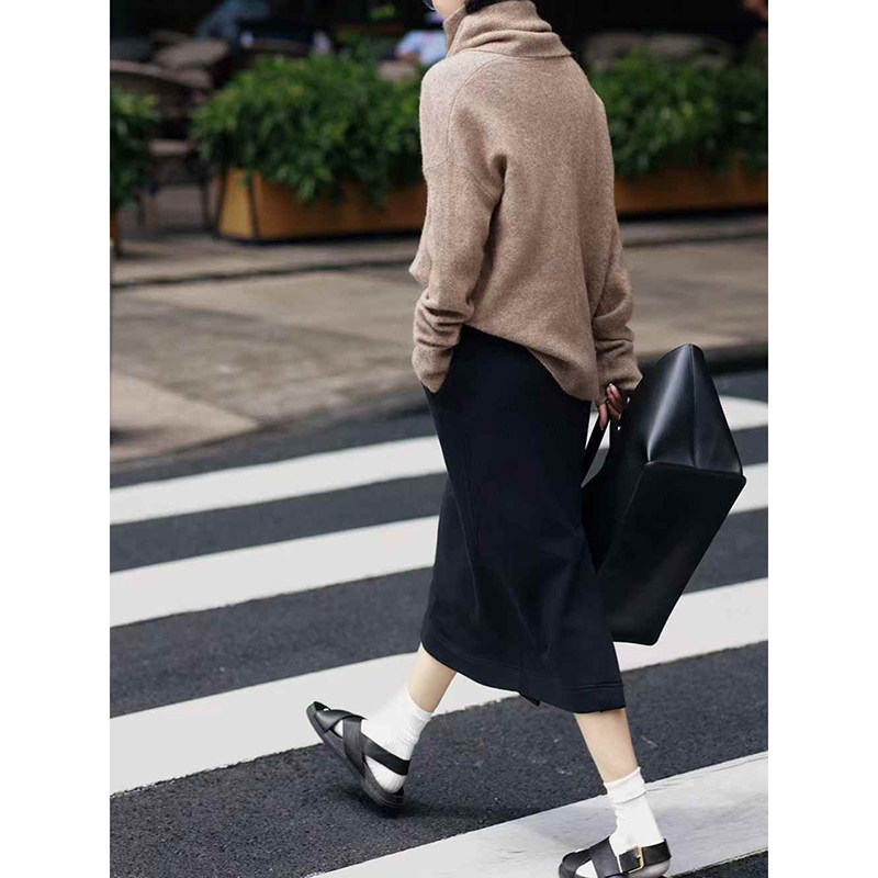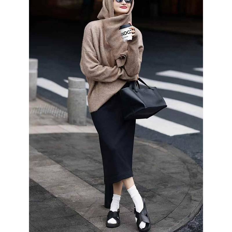 新款潮流穿搭套装女2025冬季卡其色宽松长袖毛衣黑色半裙两件套