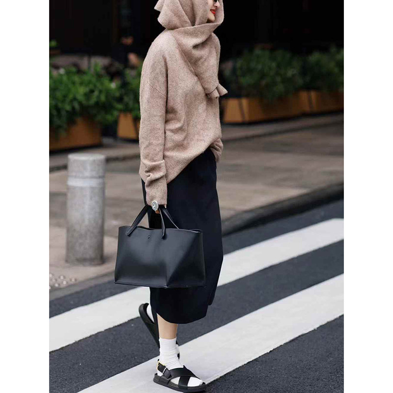 大牌卡其色宽松长袖毛衣黑色半裙
