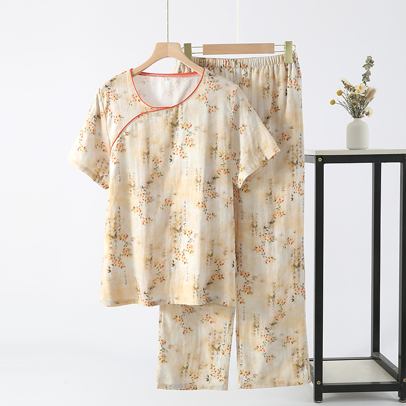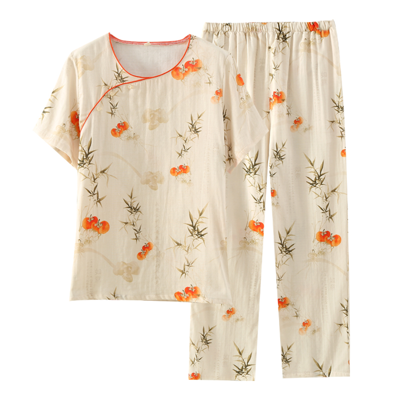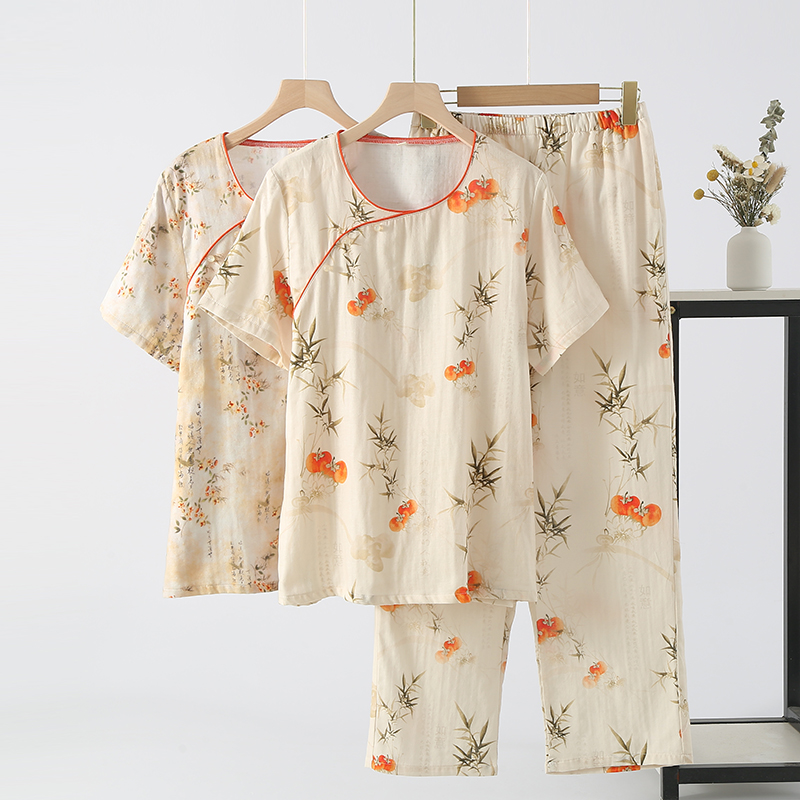 国风纱布纯棉双层棉纱女士夏季新款复古风短袖长裤套装居家服睡衣