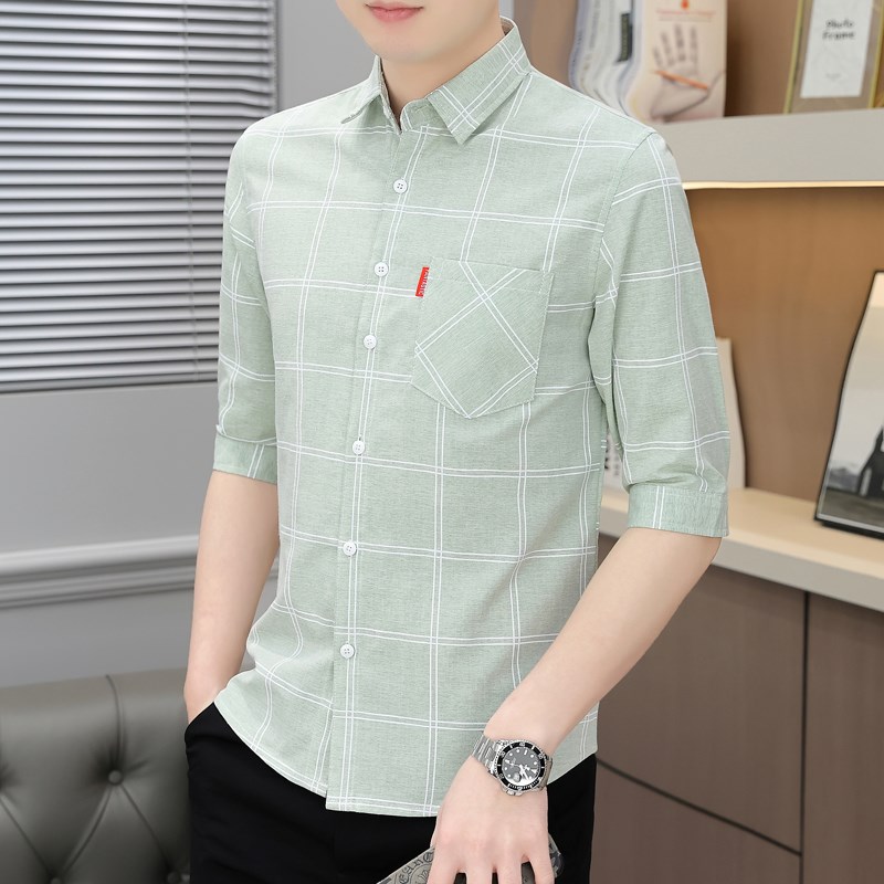 夏季薄款七分中袖衬衫男士2024新款格纹短袖寸衫修身翻领口袋衬衣