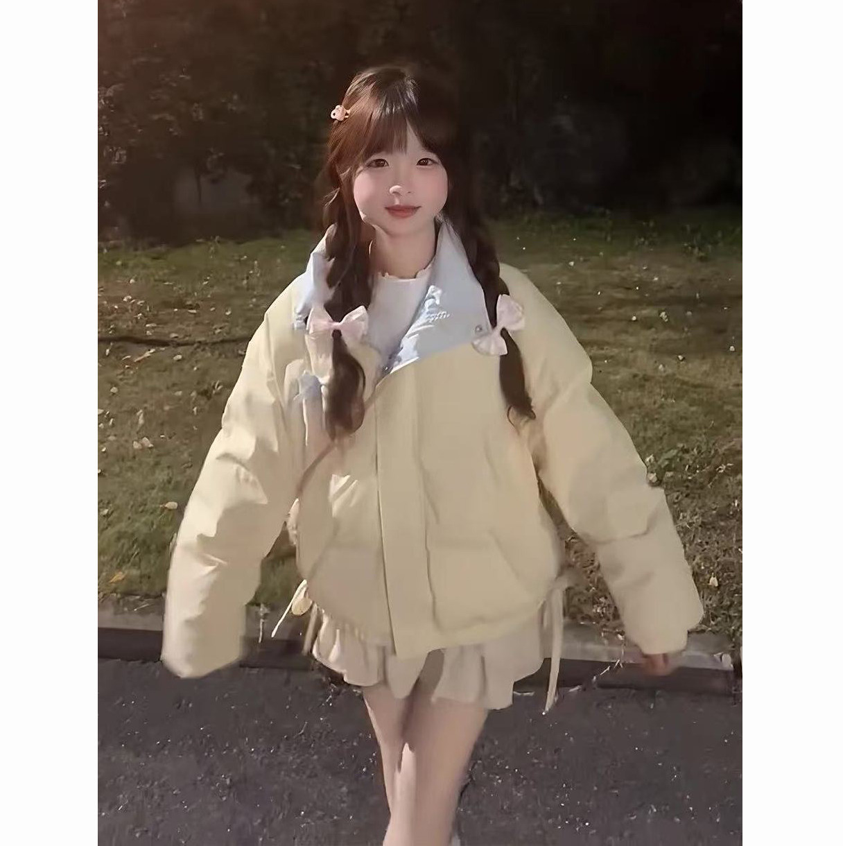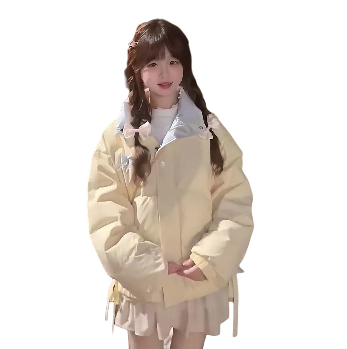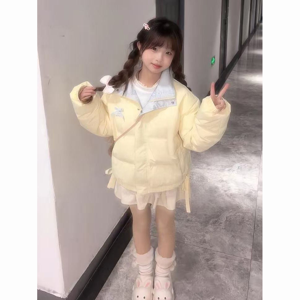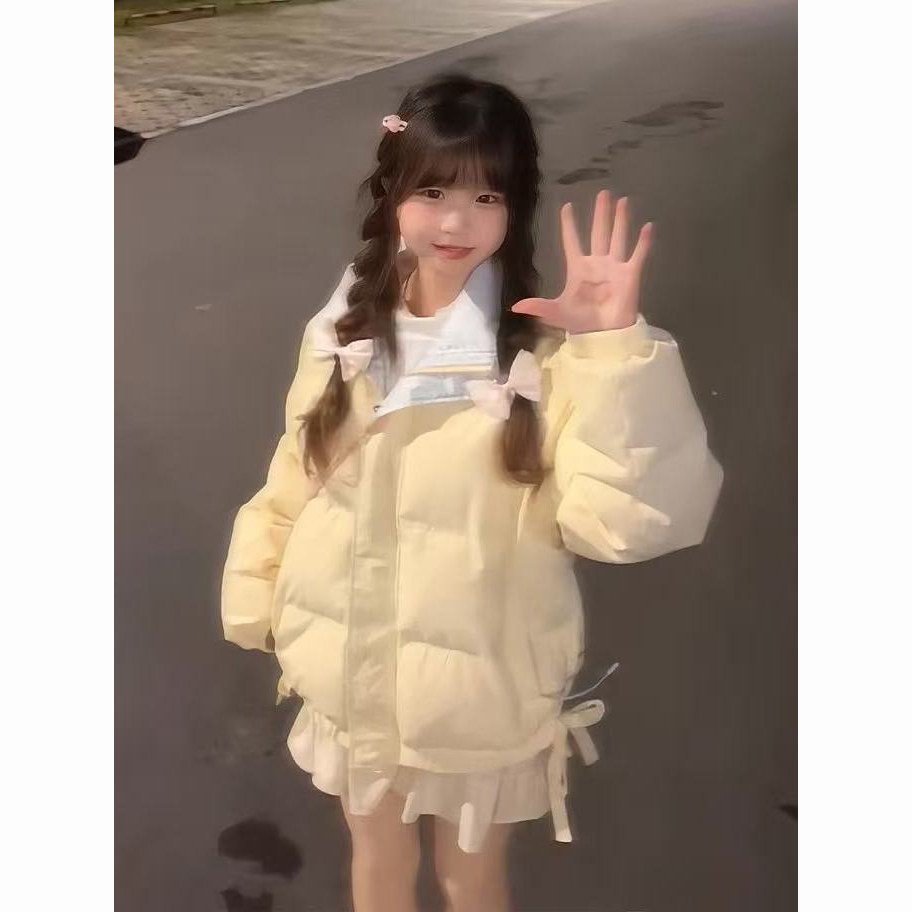 秋冬季甜美风蝴蝶结黄色小个子棉服女新款百搭宽松学生面包服外套