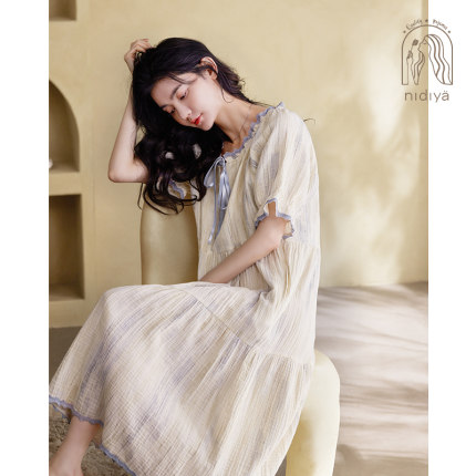 妮狄娅睡衣睡裙女夏季纯棉纱布短袖方领宽松大码休闲中长款家居服