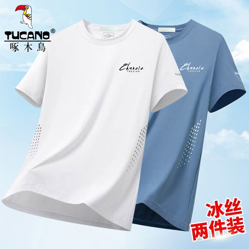 啄木鸟夏季男士冰丝大码薄款短袖t恤透气速干体恤休闲百搭半截袖