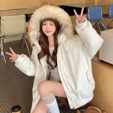 MKManley中长款pu皮羽绒服女大毛领连帽冬季派克服皮草外套新款