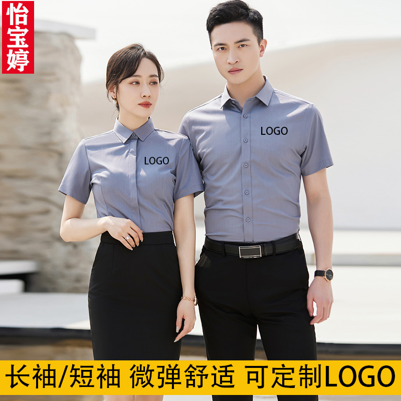 高品质男女职业浅灰色长短袖衬衫免烫工装定制LOGO微弹衬衣工作服