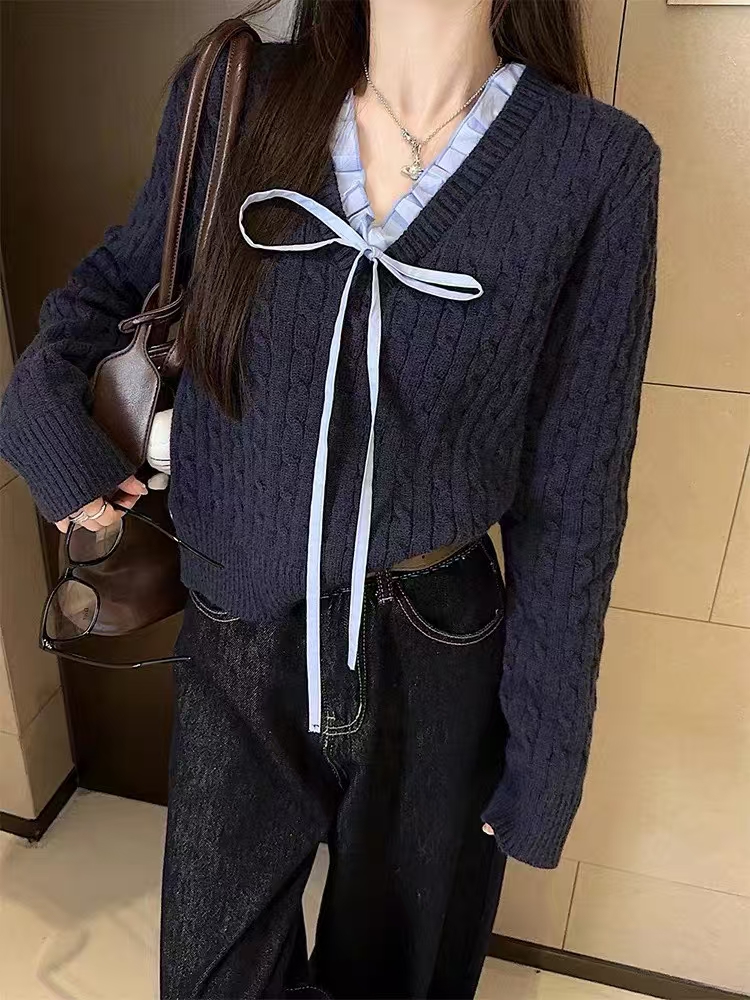 甜美气质v领系带蝴蝶结麻花长袖毛针织衫女秋冬木耳边假两件上衣