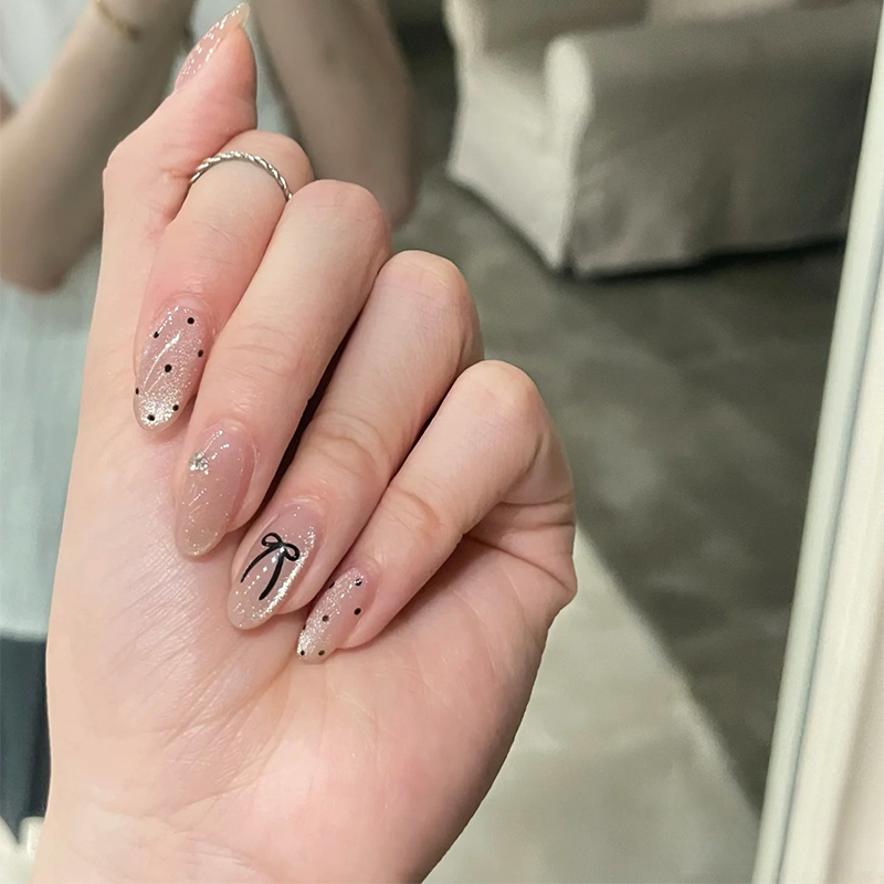 夏日显白甜酷水光猫眼手绘蝴蝶结波点美甲成品手工定制穿戴甲拆卸