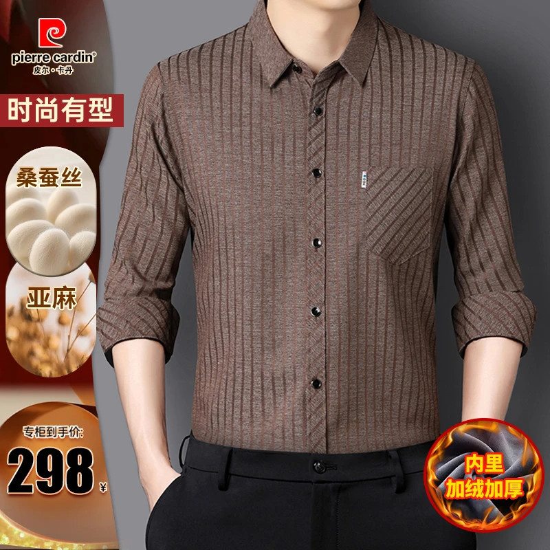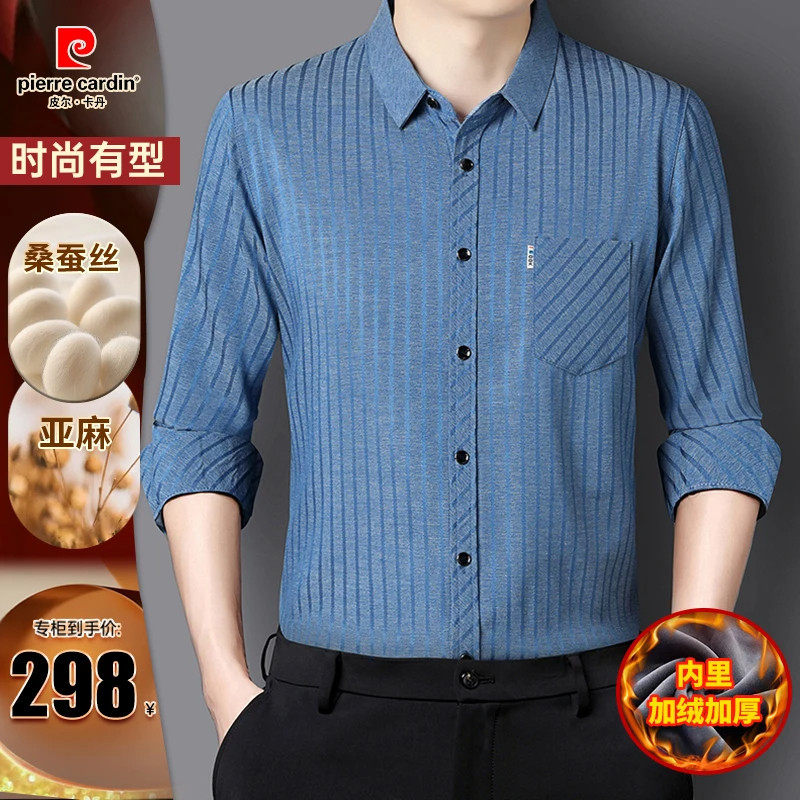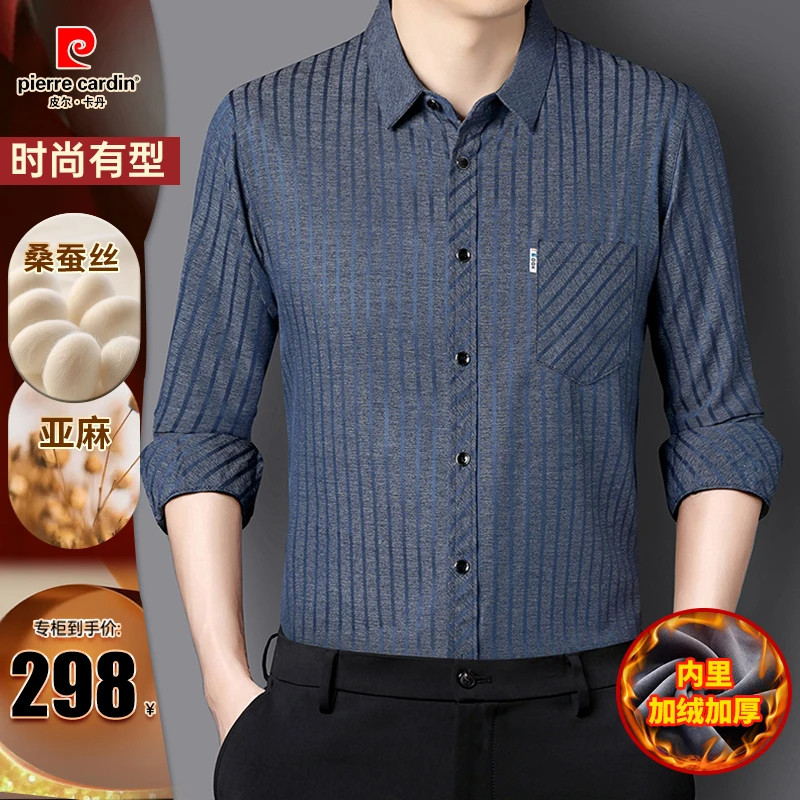 皮尔卡丹男士桑蚕丝亚麻加绒长袖衬衫舒适保暖真口袋条纹棉麻衬衣