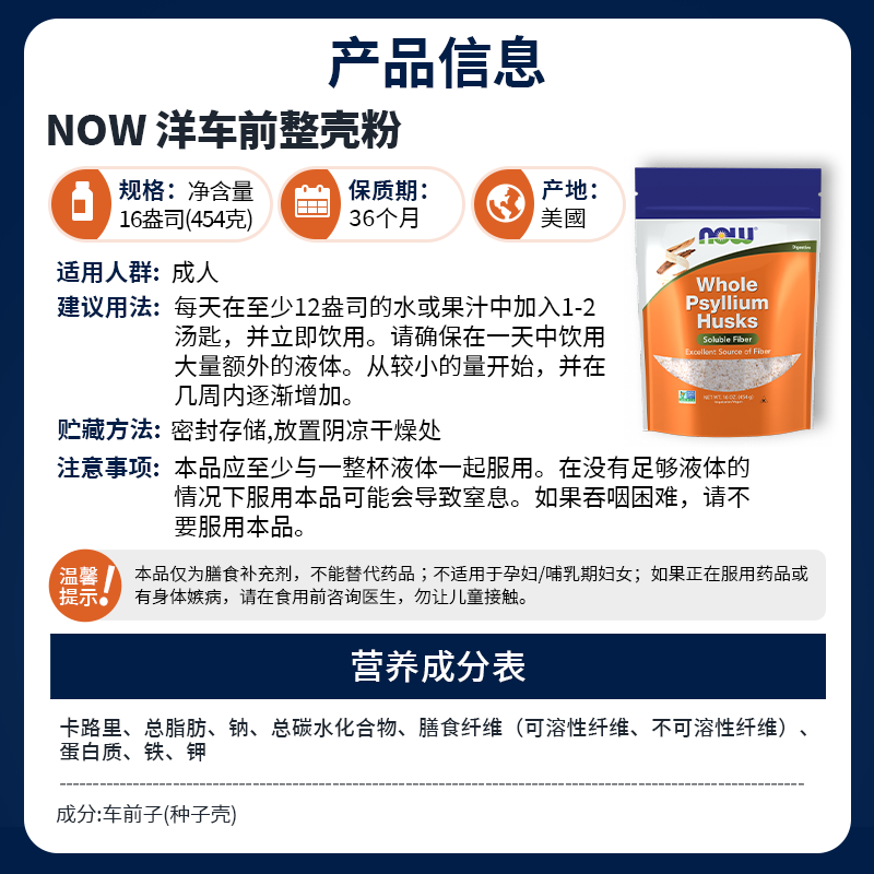 nowfoods美国进口洋车前子壳粉膳食纤维人用食品级代餐圆苞猫咪用
