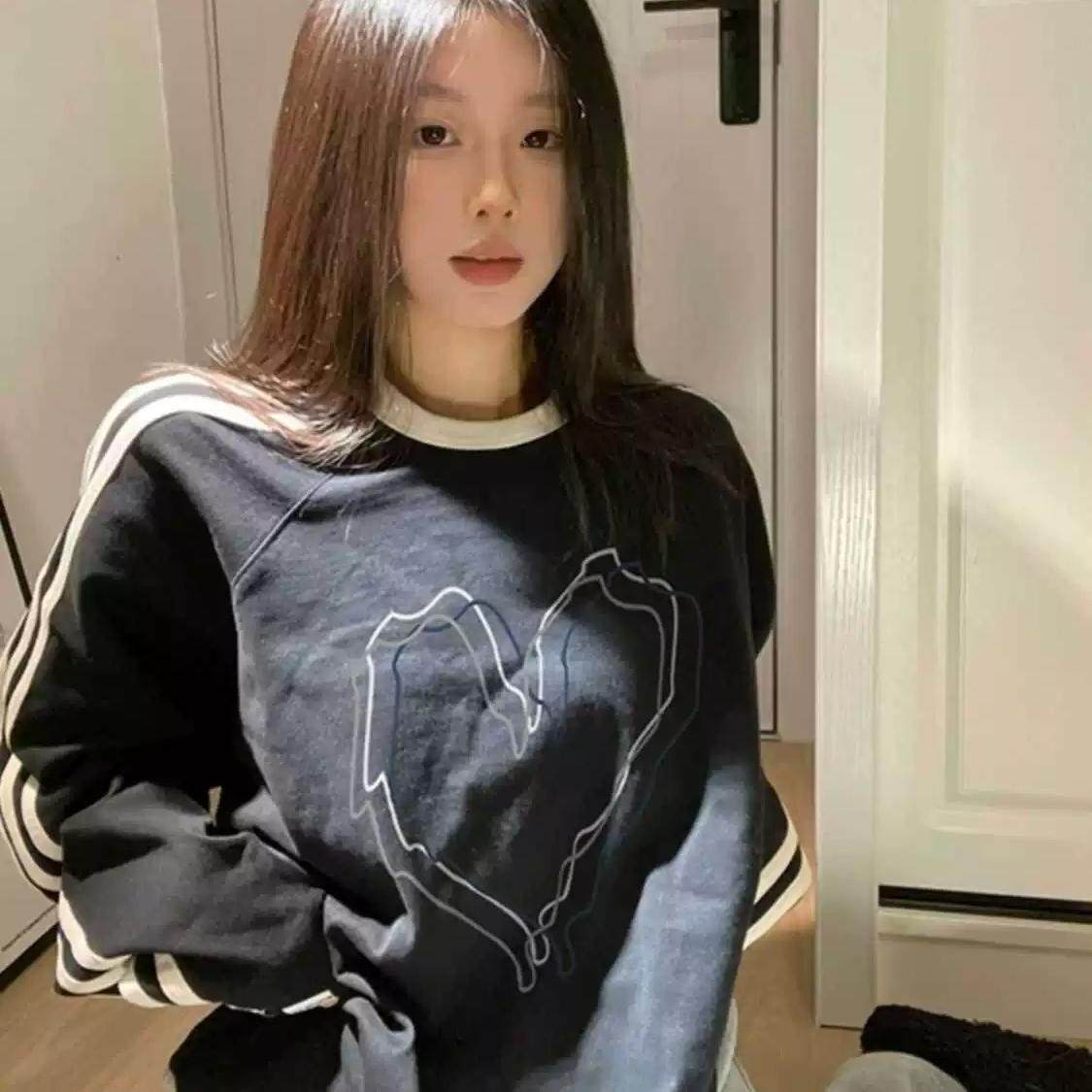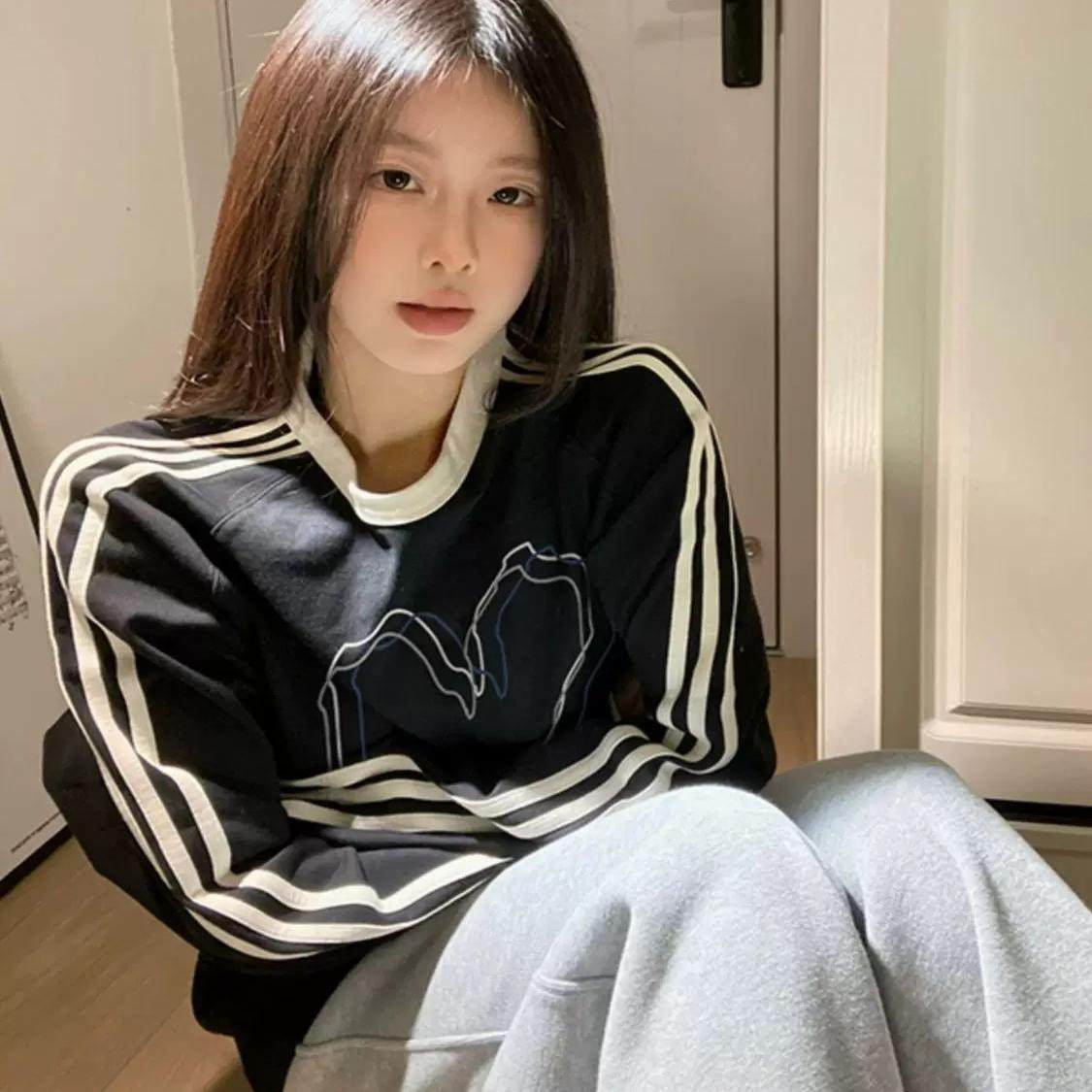 美式复古三条杠加绒纯棉女卫衣大码无帽宽松慵懒长袖套头上衣圆领